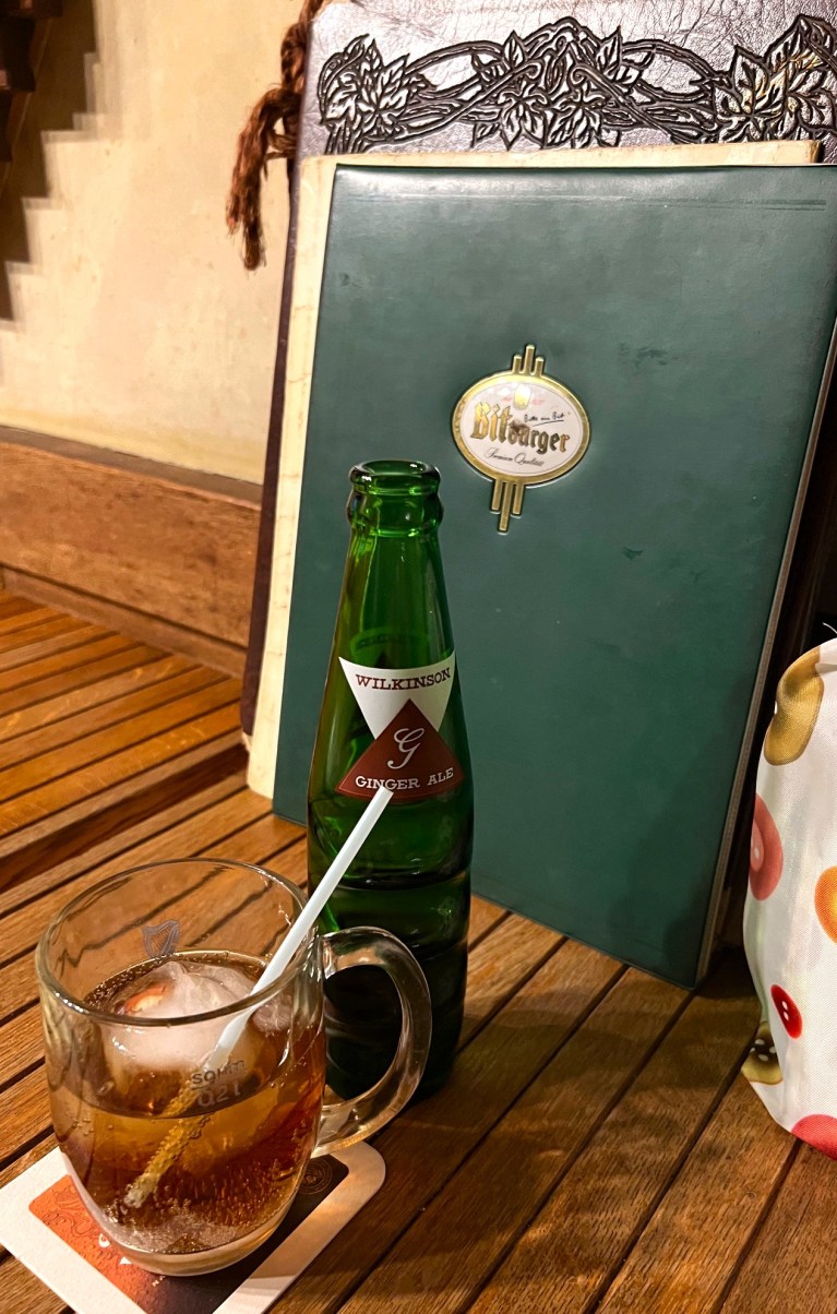 Shin has been suffering from cedar-pollen fever for decades, while Mei-Shun a kind of Atopic dermatitis between clavicles since a few years before. Professional husband therefore advises novice wife well; when she has rashes, alcohol might affect adversely. That is why she shared with him above bottle of dry ginger ale served at their favorite German restaurant on weekend.