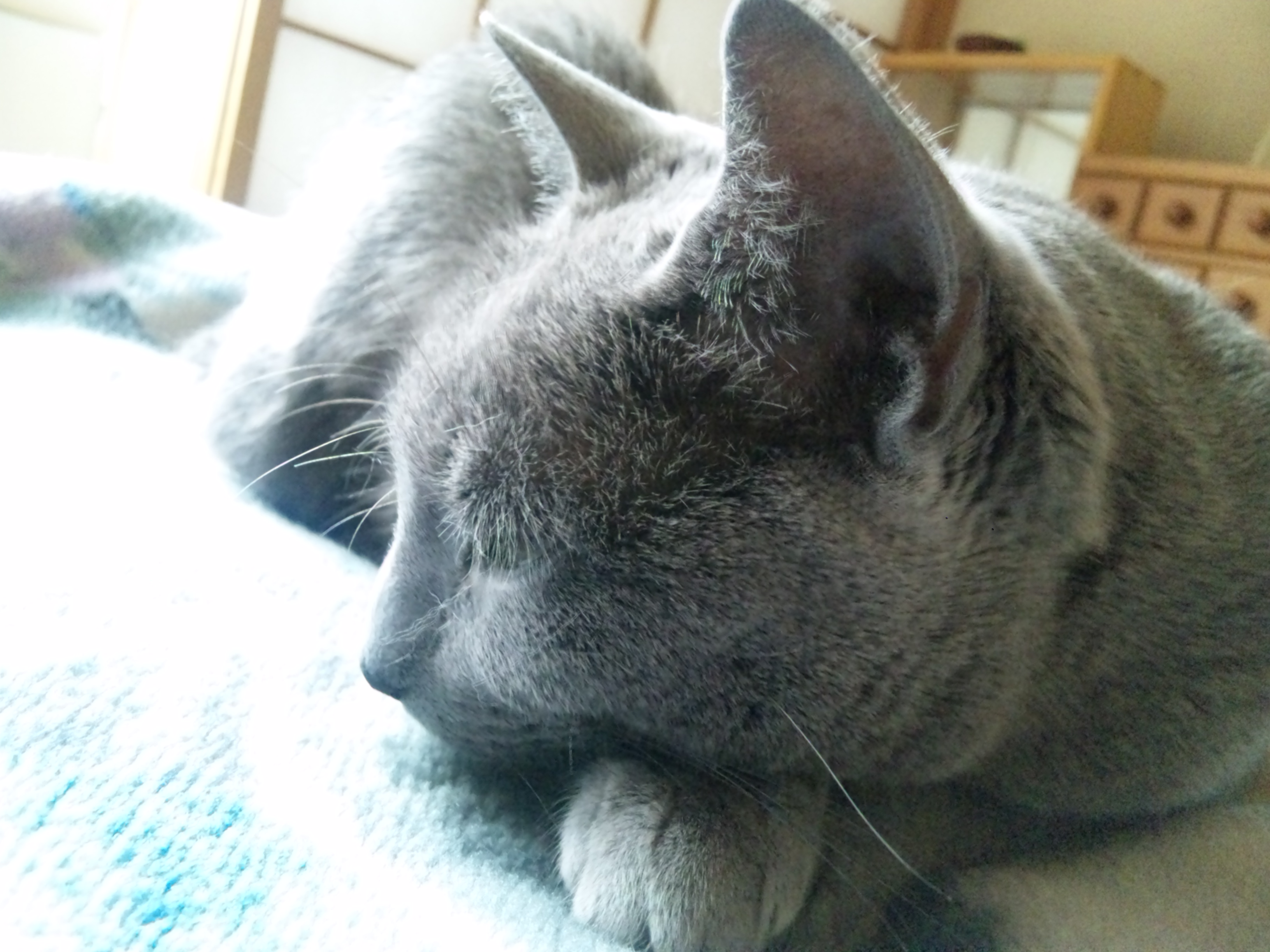 Mikan-chan has a pedigree certification. However, she looks much smaller than stereo-typed Russian Blue breed. Her round face, soft muzzle line and fluffy coat, all different from the ones awarded in cat shows. Well, does it matter? She is the prettiest in the world for us. And that is all.