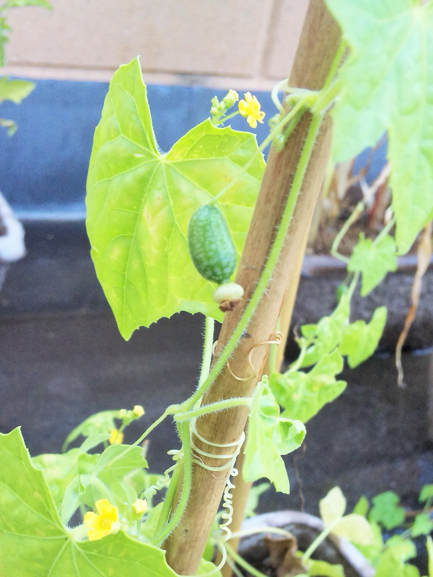 Today would be the last to have this torrid weather, we heard. Growling wind has been so strong that our cucumber vines were all blown down on the ground. Only one among three babies stays alive. Are you edible? Shin tried a bite, said that it tasted sour. Even kappa living in Ushiku Pond would not like you …