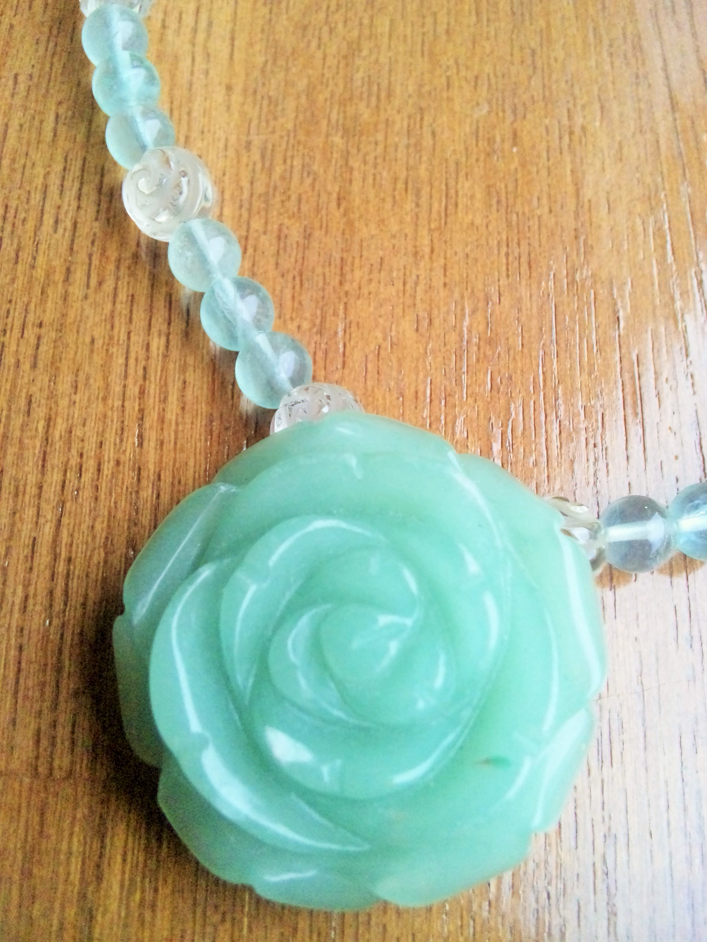 StandardThank you so much, Professor S. She kindly sent Mei-Shun a delicacy of handmade again. Truly amazing is her technique and sense of beauty to employ such cute rose-shaped crystal beads. And this jade rose represents her warm regards. That must be why it just fits on the little cup behind Mei-Shun’s collarbone.