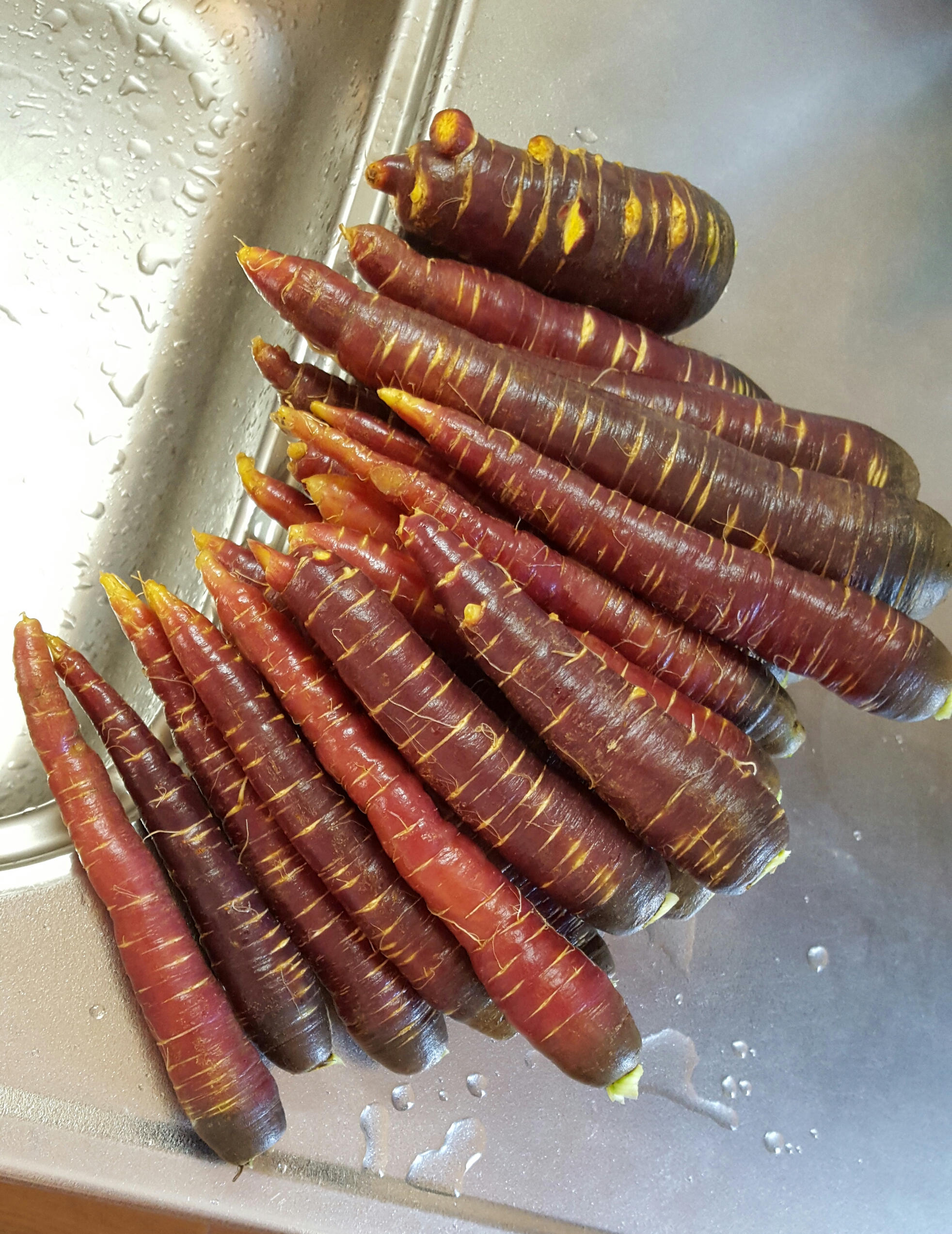 Washed Up Standard Here are black carrots grown by Tele-farm. Now our refrigerator is full of them, with normal orange ones already stored. They will make a little earlier Christmas gifts for horses, while cooking vegetables is a lot of fun for Mei-Shun as well.