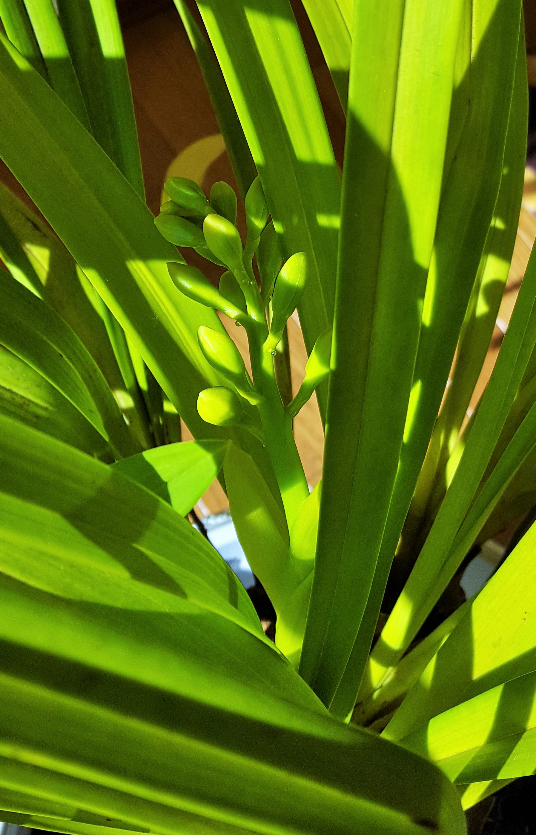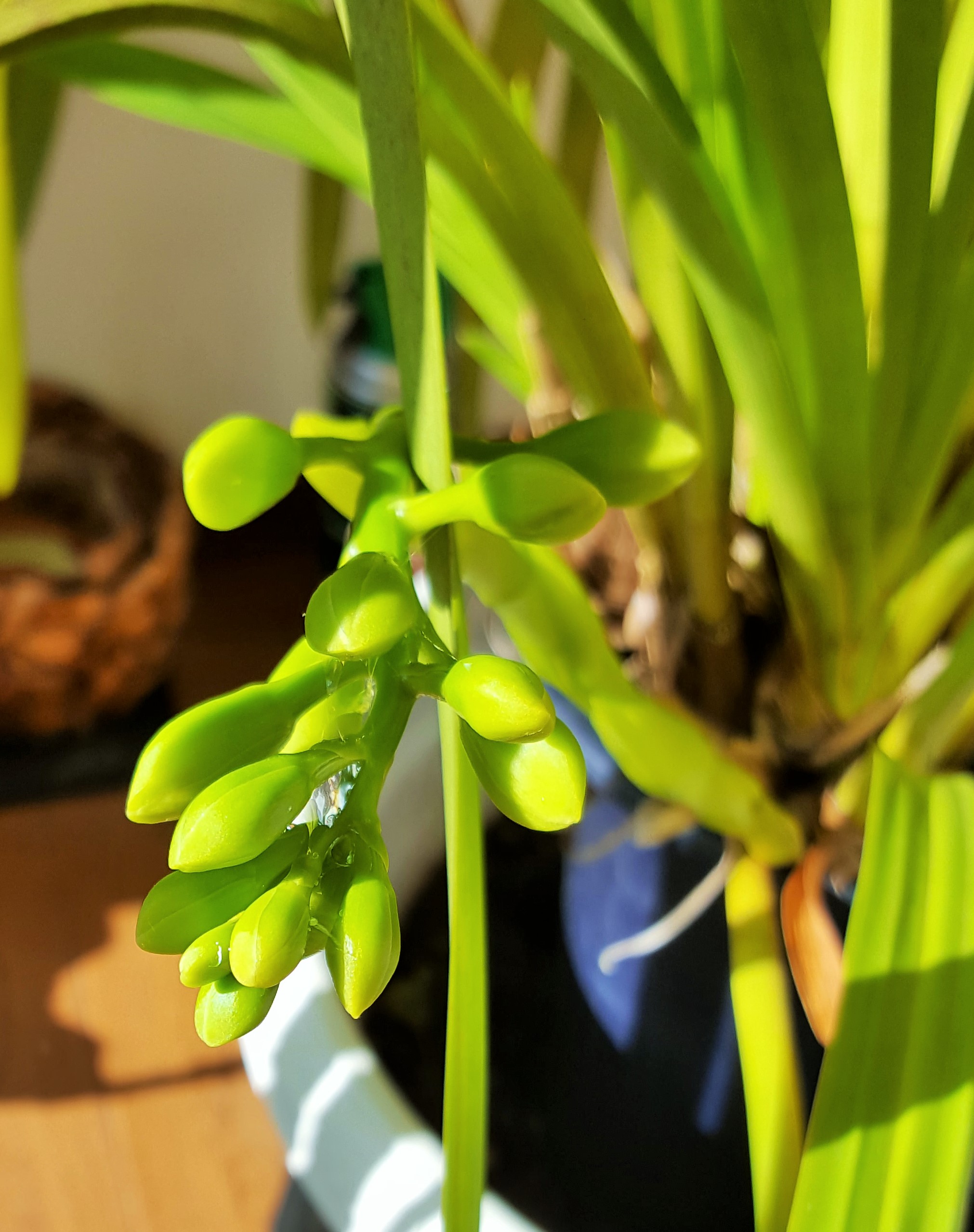 It looks twins would follow these cymbidium princesses. Since flower buds put on transparent honey dew, we can distinguish them from leaf ones. Oh, Mei-Shun was so careless that she hurt a bit of the eldest. Your highness, please kindly let her stay grateful for your generosity. Younger ladies are safe, growing day by day. Mom-in-law’s crab cactus pot also holds many buds in bright pink at each top of leaves. Our Christmas might see some of them bloom as called.