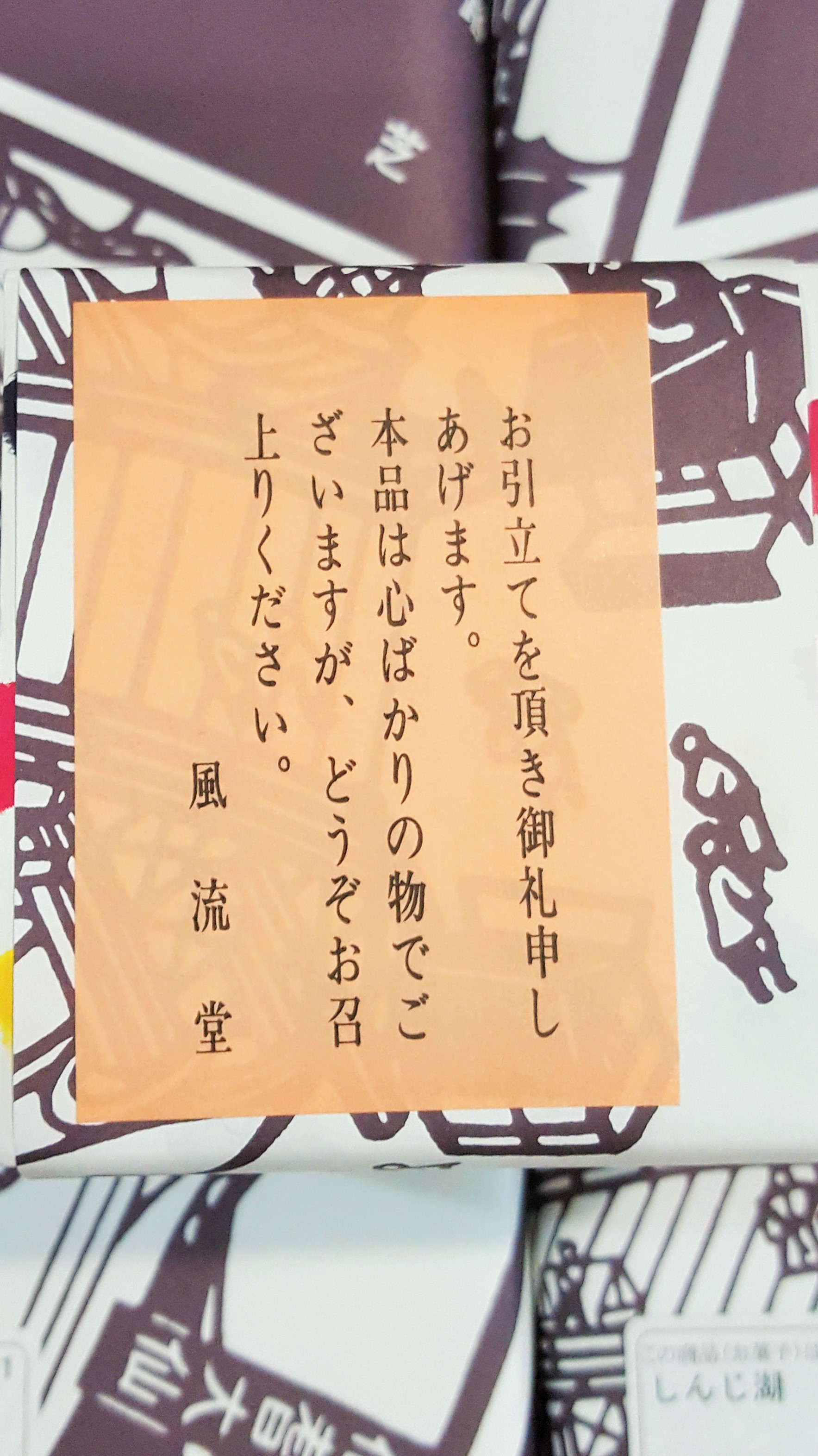 Standard風流堂=furyu-do, based in Matsue, Shimane Prefecture is on Mei-Shun’s favorite Japanese sweets shop list. When their products were available at the nearest department store, she used to visit there to buy seasonal gifts; 御中元=o-chugen in summer, 御歳暮=o-seibo in winter. However, as informed that the store will be closed soon, she started internet shopping. 風流堂 is so kind to send her a handwritten letter and a little gift attached to ordered goods.