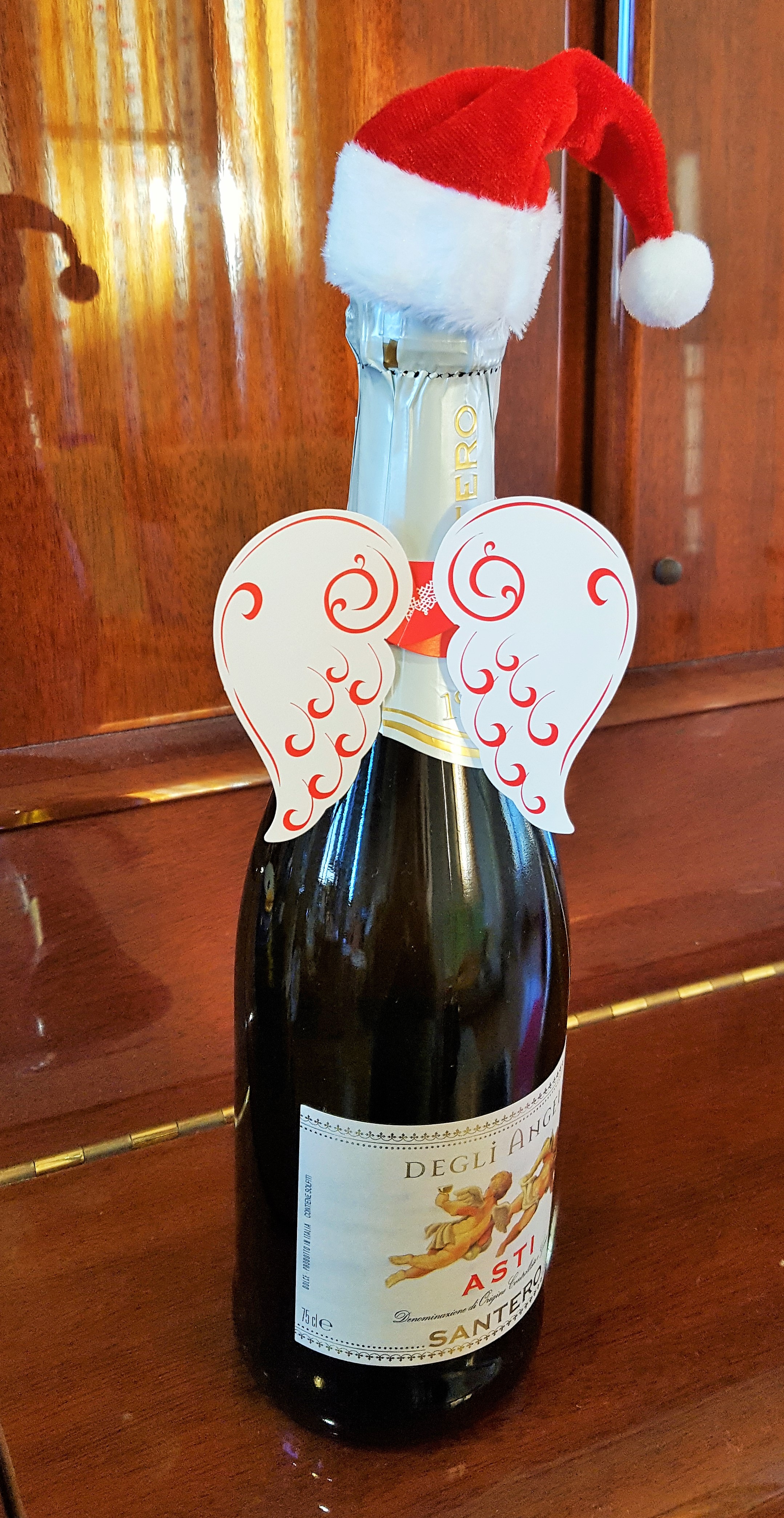 StandardOne of our cymbidium princesses has a trouble in stalk; she bows so deeply that her head looks like resting on a leaf. Mei-shun used a summer bell as her prop. How’s it going? Hum, it is not awful, yet another one featuring Christmas might be better. Your highness, please give her a moment to find nice replacement. Regarding this joyful event, she found a lovely bottle of wine adorned with angel’s wings and a Santa Claus cap. He motivates her to eat and exercise properly preparing for the holy night.