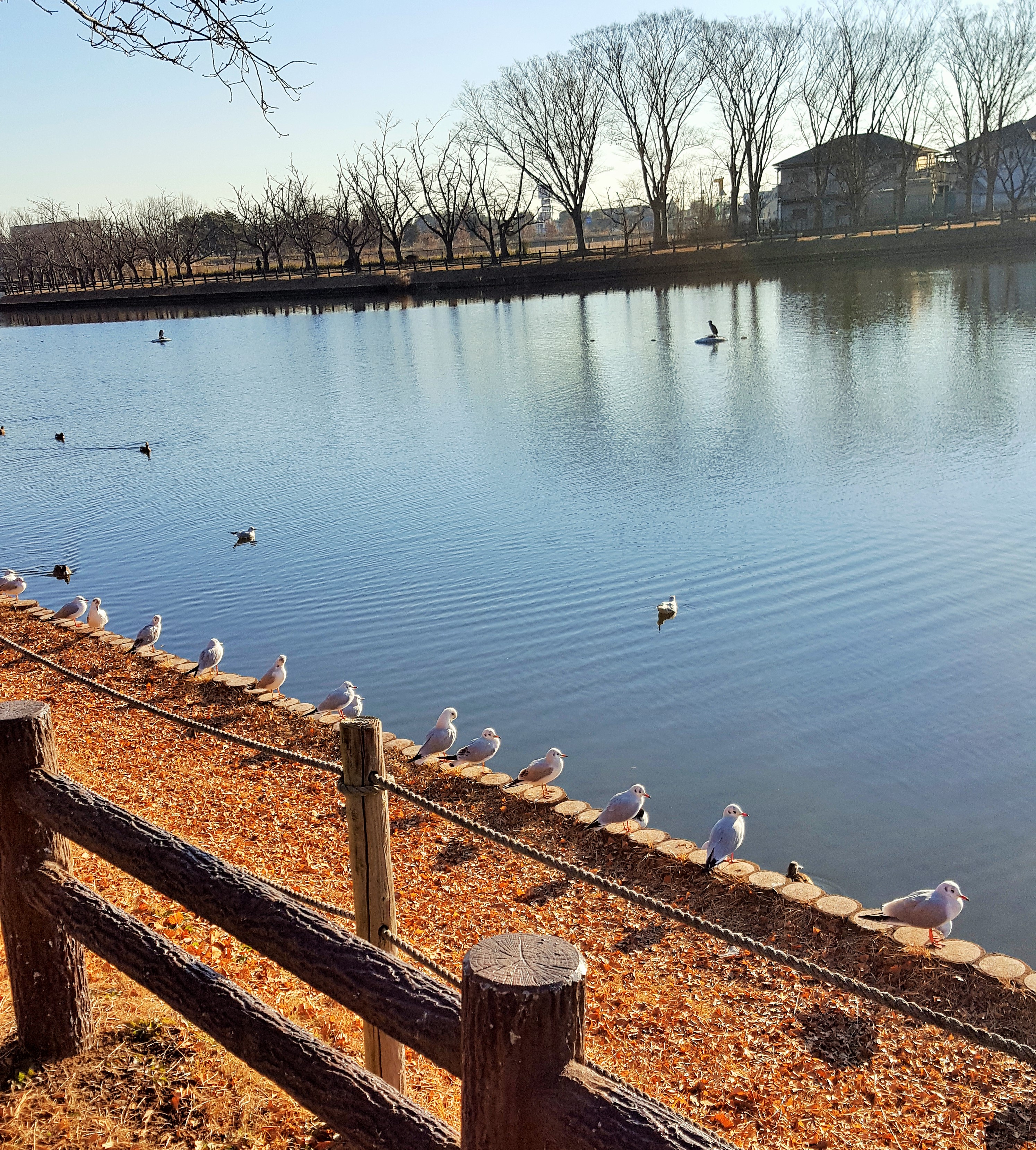 Mei-Shun visited 乙戸沼 Park — long time no see. Winter mornings are too cold and dark to be there after driving Shin to the nearest station, so she has used to walk to the nearest shrine since around 大雪, the third of winter 二十四節気. Amazingly beautiful it is. A flock of wild ducks play on the pond with white dots of swans. Yuri-kamome or Larus ridibundus, great to see you here. It looks like grey herons rest on each fountain nozzle, or are you cormorants?