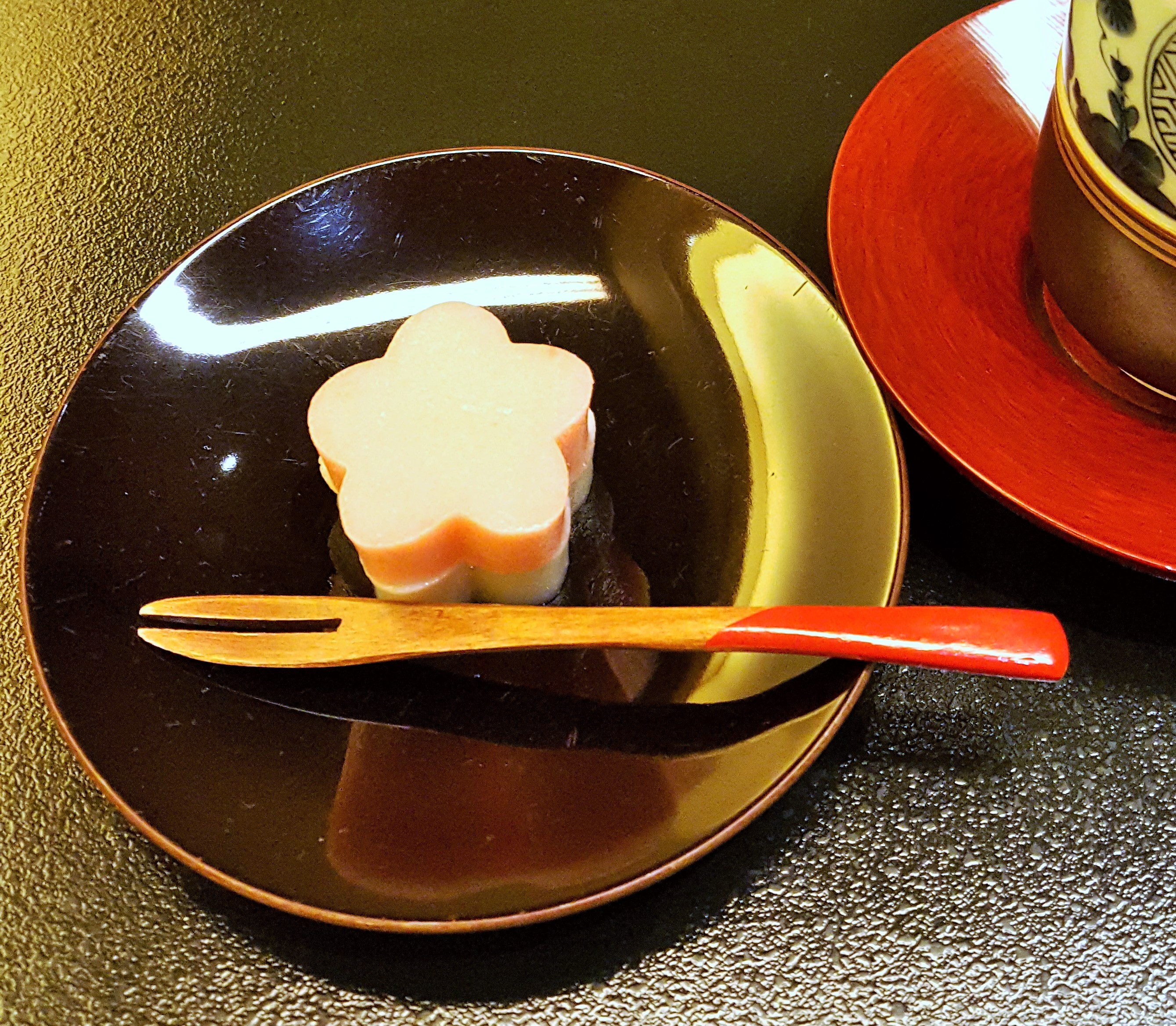 Here is 治部椀=jibu-wan, simmered vegetables, duck meat and 簾麩=sudare-fu, wheat gluten cake shaped like a bamboo blind dressed with thick starchy sauce served in a soup bowl. This is one of favorite dishes for Shin and Mei-Shun at a restaurant in Shinagawa, while reminds the latter of a cooking book she bought in preparation for marriage. It featured 治部煮 among ABCs of Japanese cuisine.