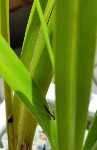 Mei-Shun gave Princess Cymby pots 2 kinds of fertilizers; one is liquid for once a week, the other solid once a month. Satisfied at their livelier looks, she found smaller (=younger?) princess accommodates an unique friend, another baby mantis. Can you kind followers recognize him/her below? Interestingly, he/she has tabby in legs, seems to camouflage him/herself as a plant.