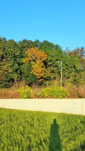 It might be one of the most beautiful scene in Japan — rice paddy after harvest dotted by persimmon trees with ripe fruits left on naked branches. Mei-Shun chose a different route today to go shopping on foot, looking down her normal lane to the nearest shrine from opposite side. Still before 15 o’clock, sunlight cannot warm her shoulders any more. It stops at yellow leaves to make them shine in gold.