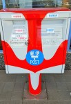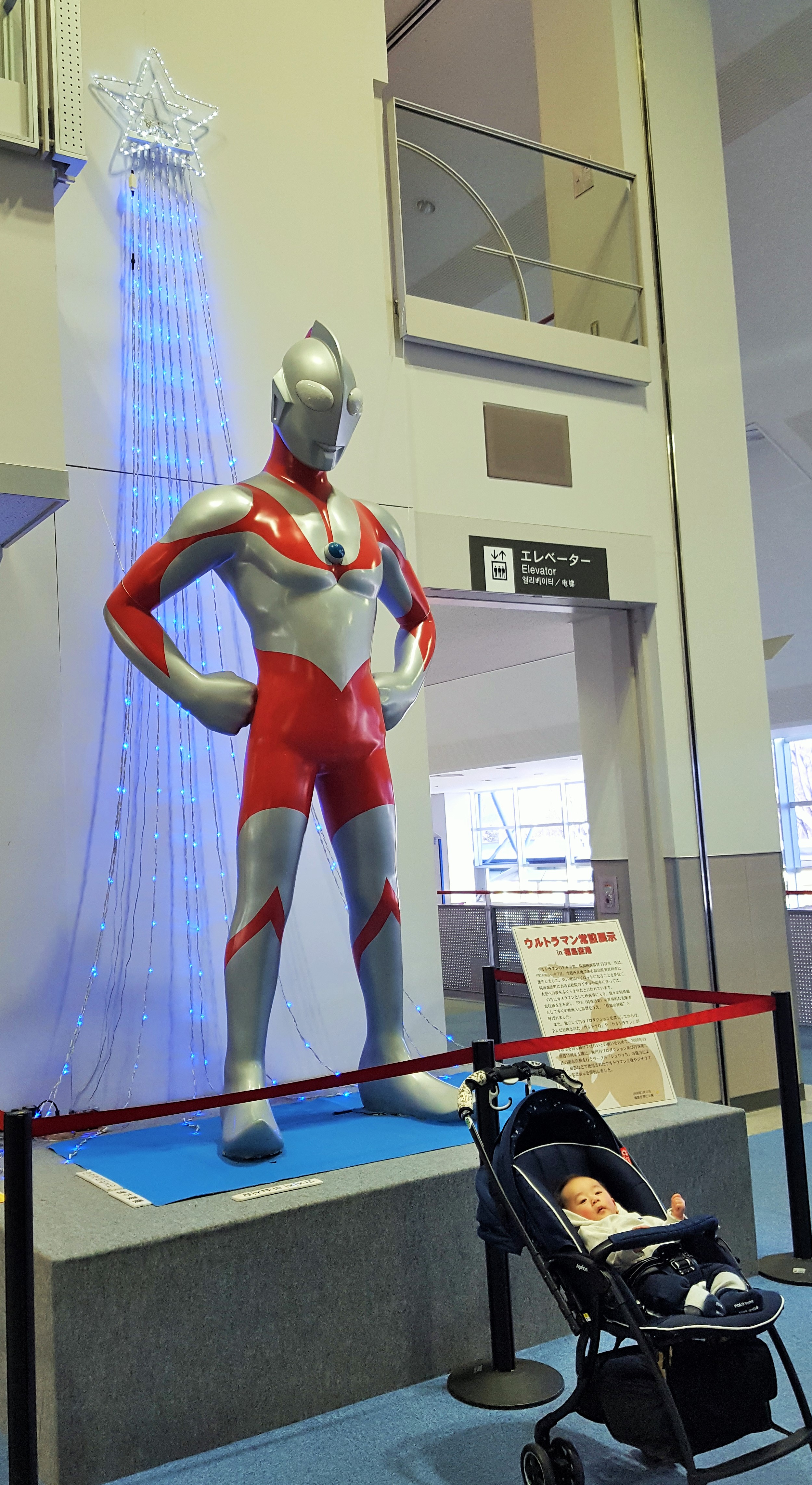 So this year’s ornament 戌=inu, dog and another cat have come to Shin and Mei-Shun. You can meet these cutest 丸=maru, round-shape animals at Fukushima Airport. It features a lot of items related to “Ultra-man” serial TV programs as well. Many figures are displayed at the entrance hall, attracting mothers with prams to take photos. A postbox is painted in colors of hero character.
