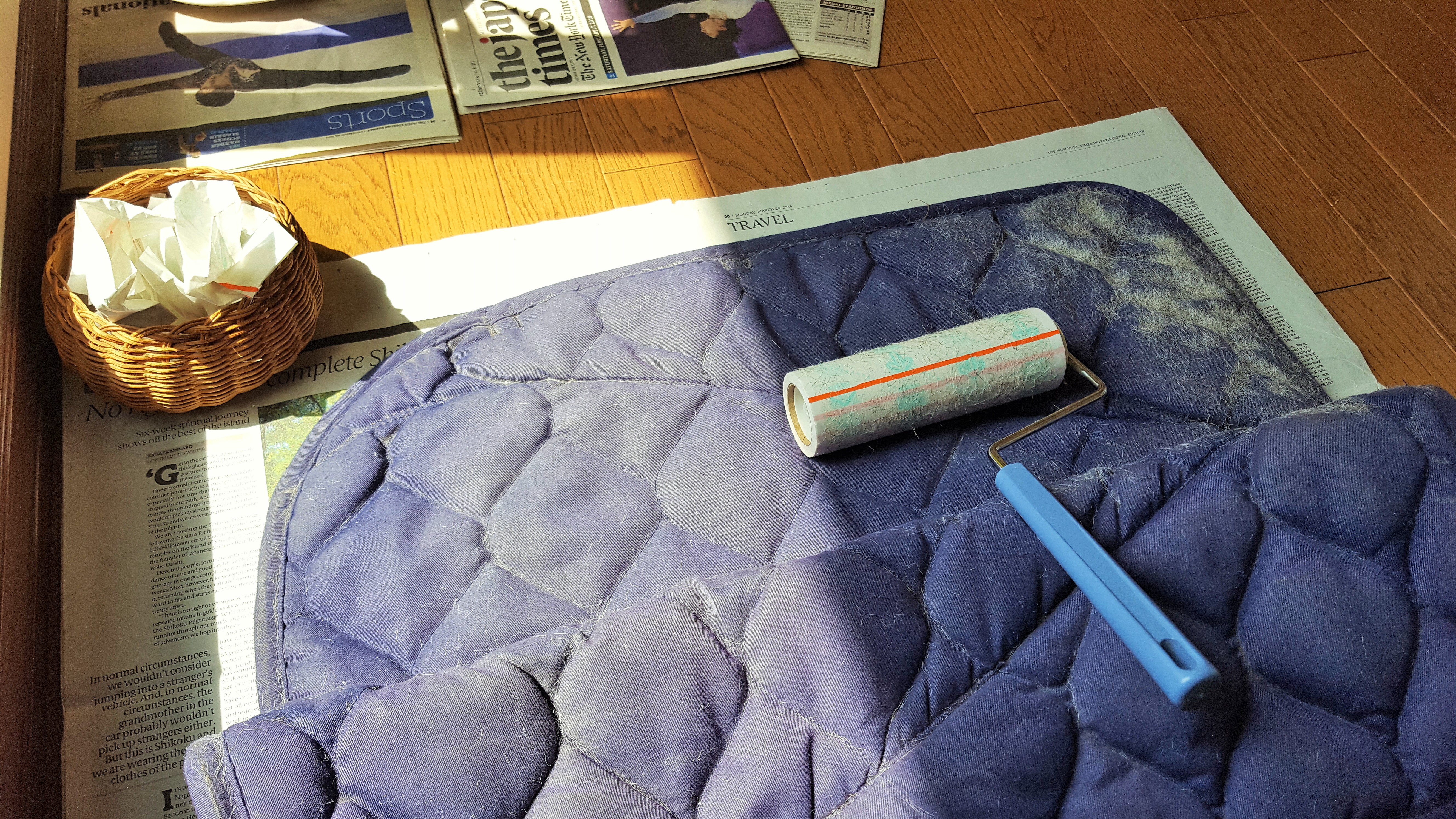 On you two whites, Vanilla-san and Maria-chan. Mei-Shun was so exhausted to clean up following saddle pad in blue that she decided to purchase another in their color or beige. Although they do not perspire much these days, change from winter coat to spring one is still going on. It is fun to take care of horseies and riding equipments, yet she has many other to enjoy with Mikan-chan treatment on the top of her list.