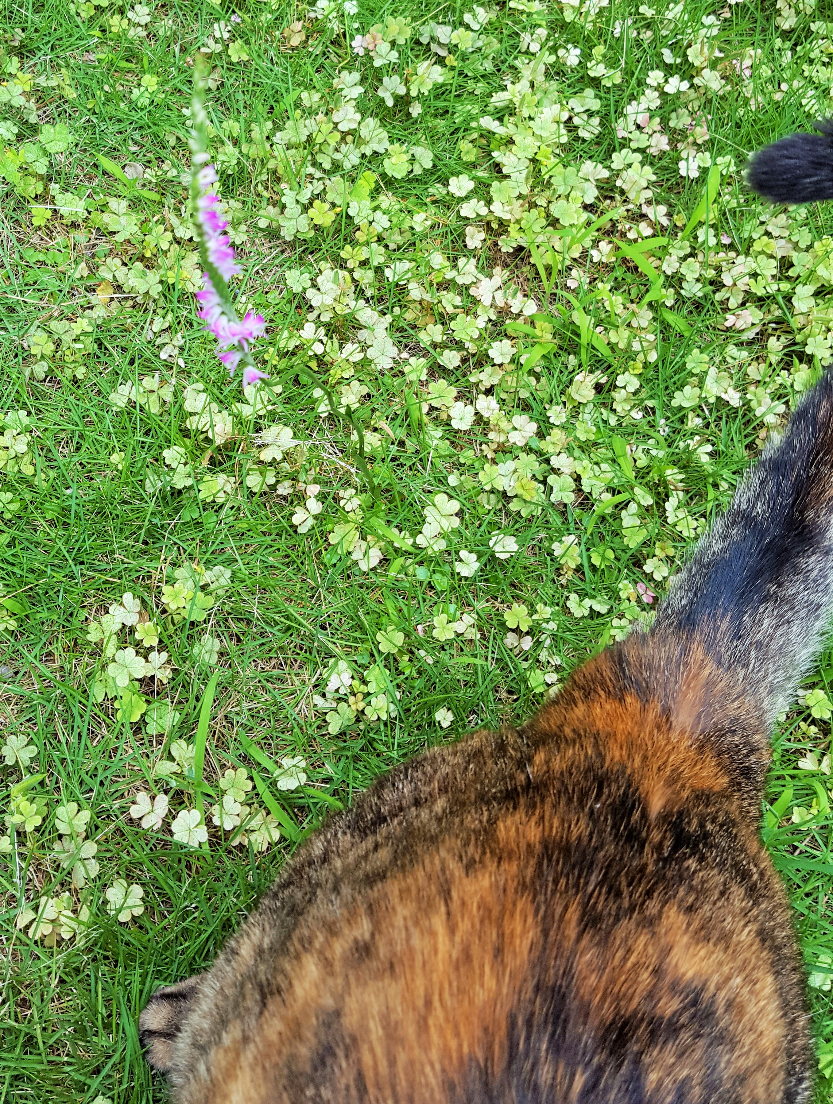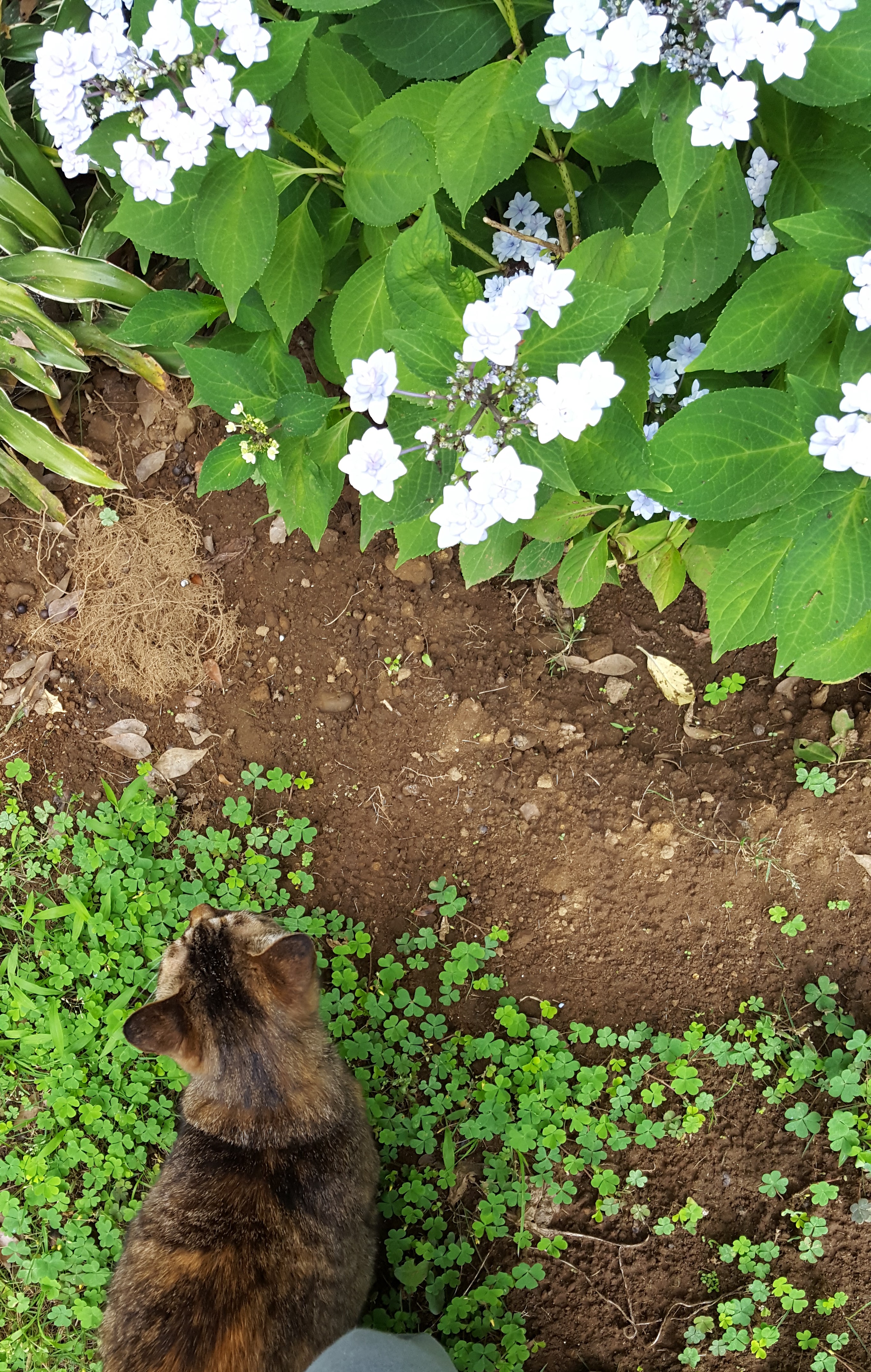Meow, here comes sister Mei-Shun, daughter-in-law of my friend mom and a generous treat giver. When she strolls around my place in the morning, I report to her what kind of flowers are in the best blossom. On the top of the list right now is this lace-cap hydrangea, her present to mom on Mother’s Day a few years ago. And a lady’s tresses follows, which she found in buds and rejoiced.