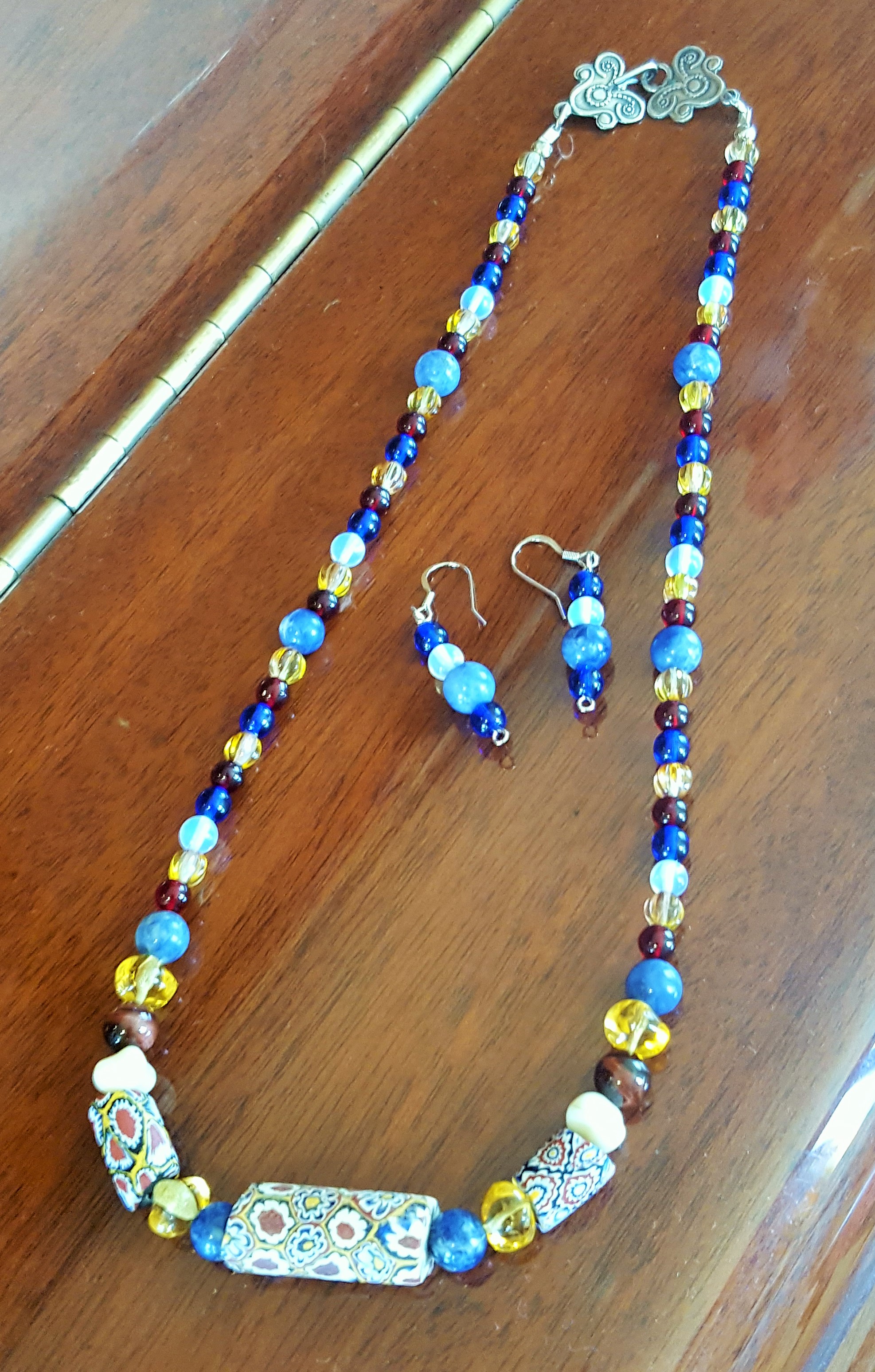 It is the first time for Mei-Shun to make gemstones into a necklace. Thanks a million to Professor S, who kindly helped it completed. Now the former can enjoy it with two pairs of earrings, followed below by one made by the latter lady. Another is of ancient Venetian beads used to exchange with slaves from southern countries. Sad history might sometimes appear as beauty in arts.