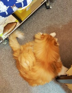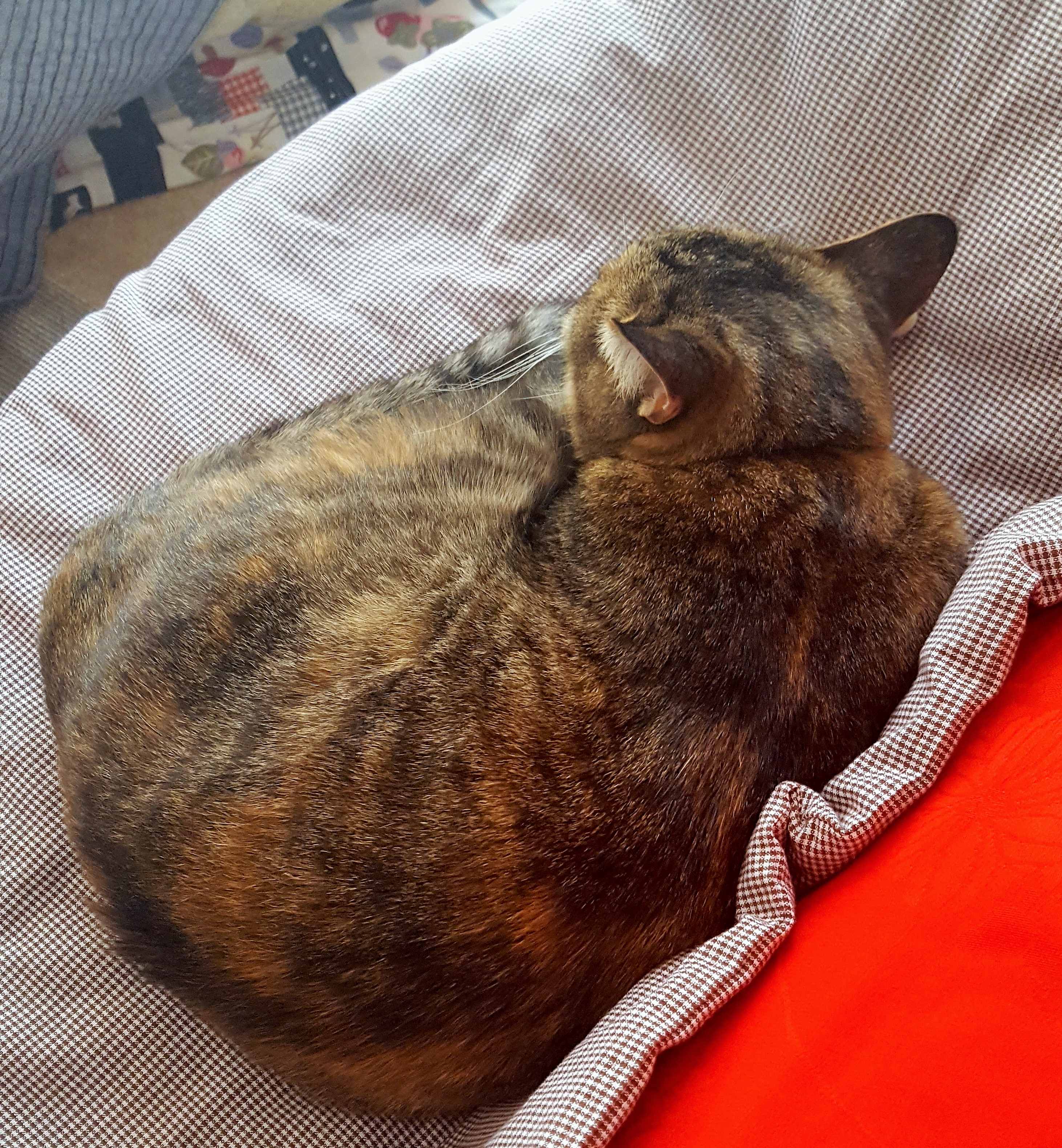 StandardMeow, I am. However, mom often lets me in these days to sleep on her sofa. Of course she does, it is mine. Hi, sister Mei-Shun comes down. I always greet her with the best smile, purr. Her only fault is that she sometimes steps on my tail before giving me a treat, hiss! Please be more careful. What, your ironing board has a hole on the covering? Mom would be kind enough to repair it.
