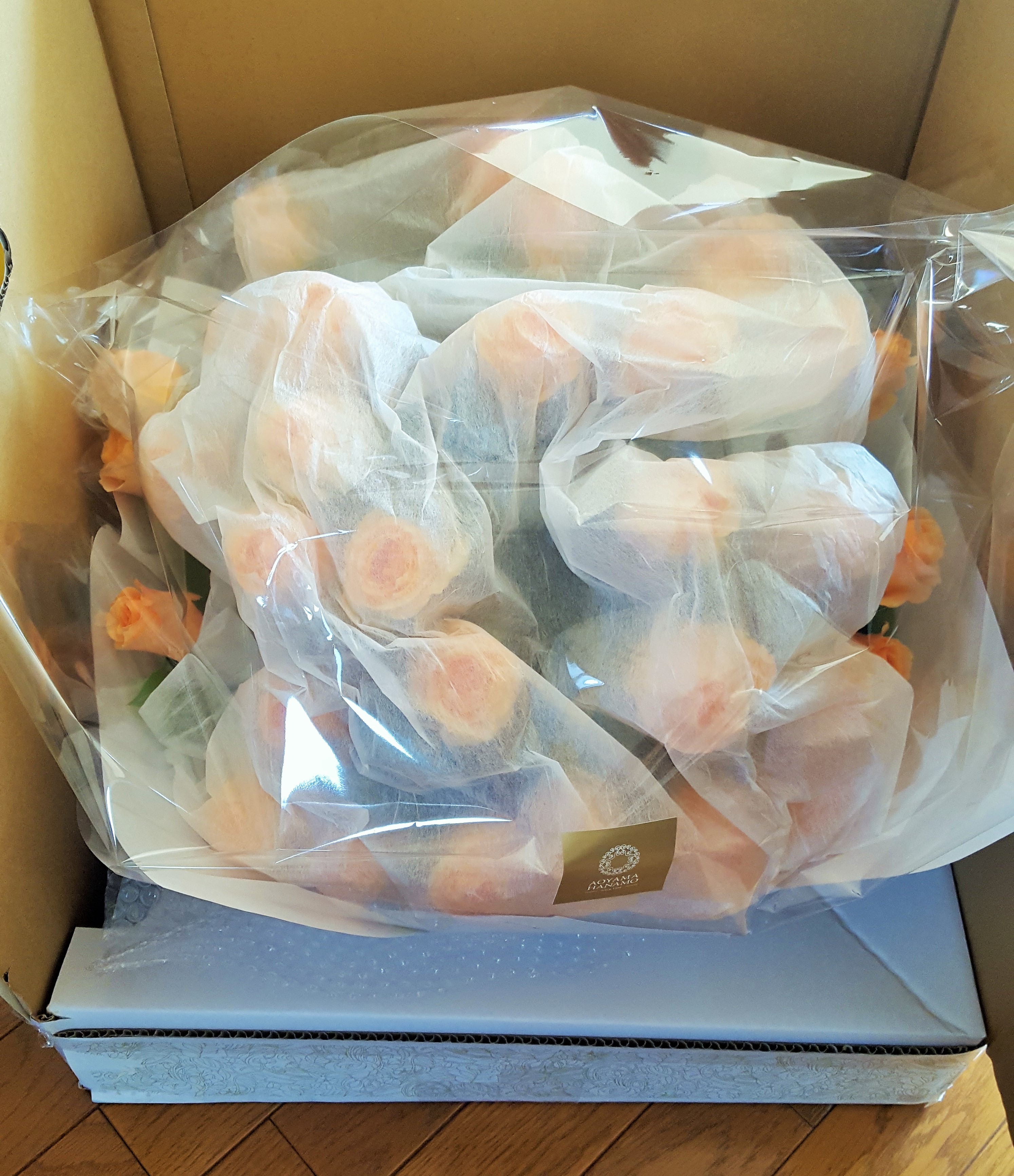 Thank you so much, Shin, for your never-to-change mind toward Mei-Shun. Hi, Mikan-chan, you like these roses as well? Shade between salmon pink and orange, flower bowl in your coat color while showing their coming wedding anniversary, the husband completely made it. And oh, the wife won the “fève” in her annual pie. Let her put on a golden crown to be today’s queen.