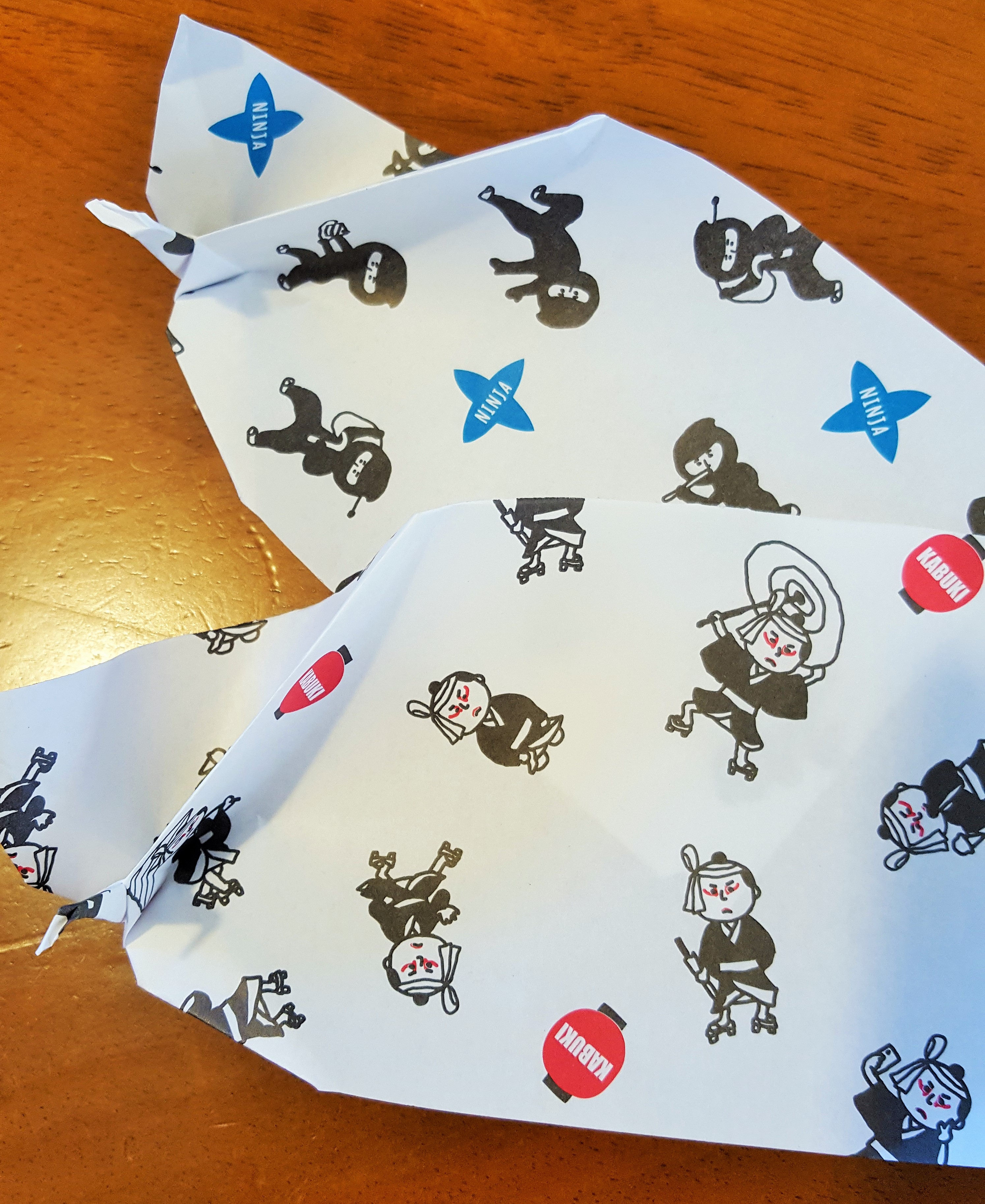 StandardNothing has changed at 大志満 in 高輪, Tokyo. Shin and Mei-Shun visited there after several months, should have said a happy new year. They were guided into 椿=Camellia Room. Of course you are here; blue birdy, we missed you hoping you did us as well. Green vegetable, sashimi, 治部椀, grilled salmon, tempura and rice. Oh, how cute these origami cranes are to hold dessert spoons!