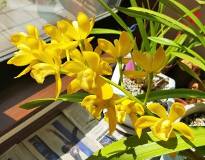 Sakura, cherry on Mei-Shun’s obi sash tonight. Cymbidium ladies still kept fresh. Momo-chan, our garden princess looks to be in a hurry to dance (please don’t, honey). In spite of red arrows on today’s weather forecast map, they are all calm in a breeze. Hi, Mikan-chan, are these flowers too warm to take a nap under? Mom would be happy to accompany you on crisps.