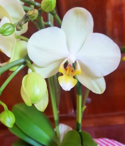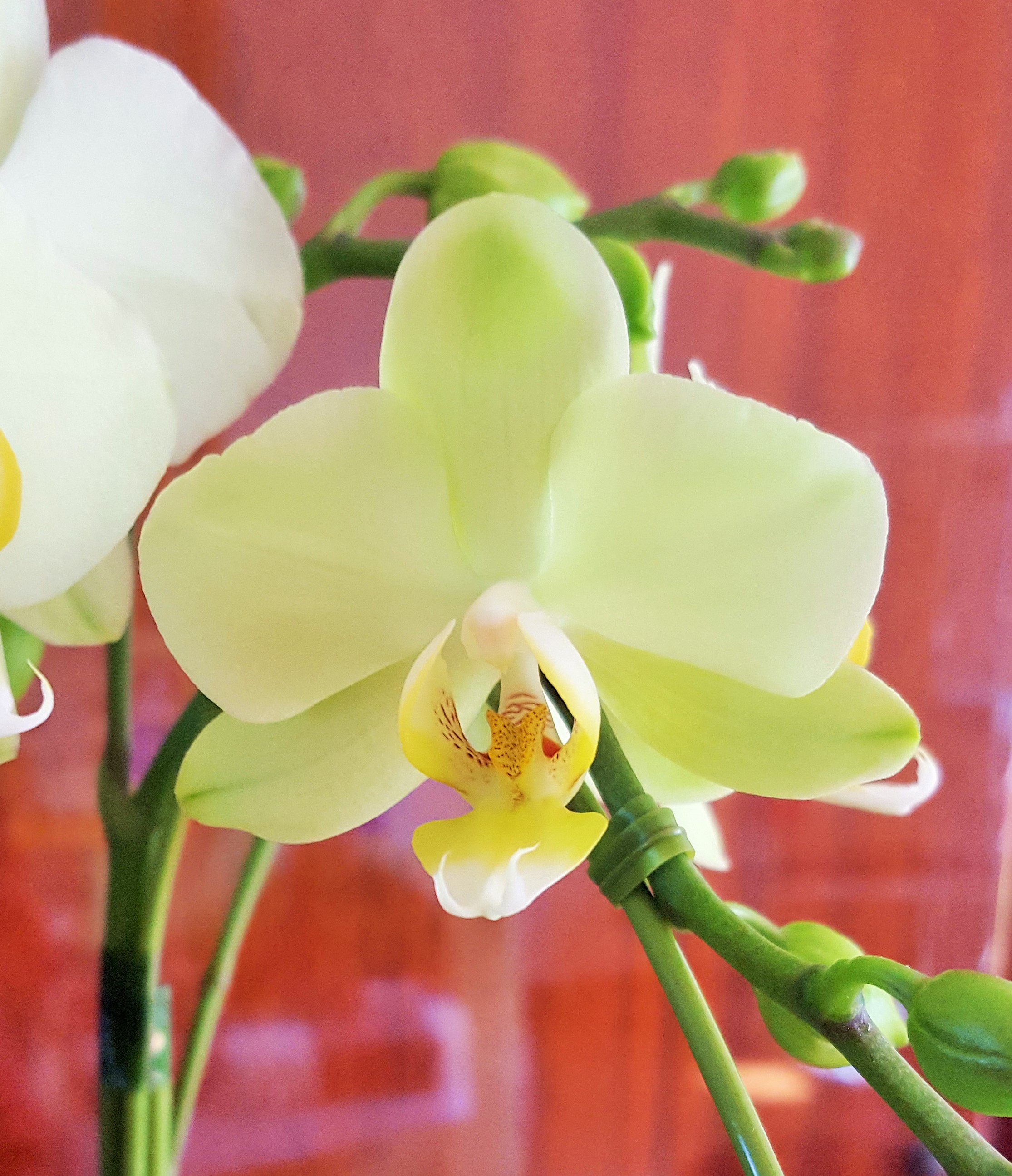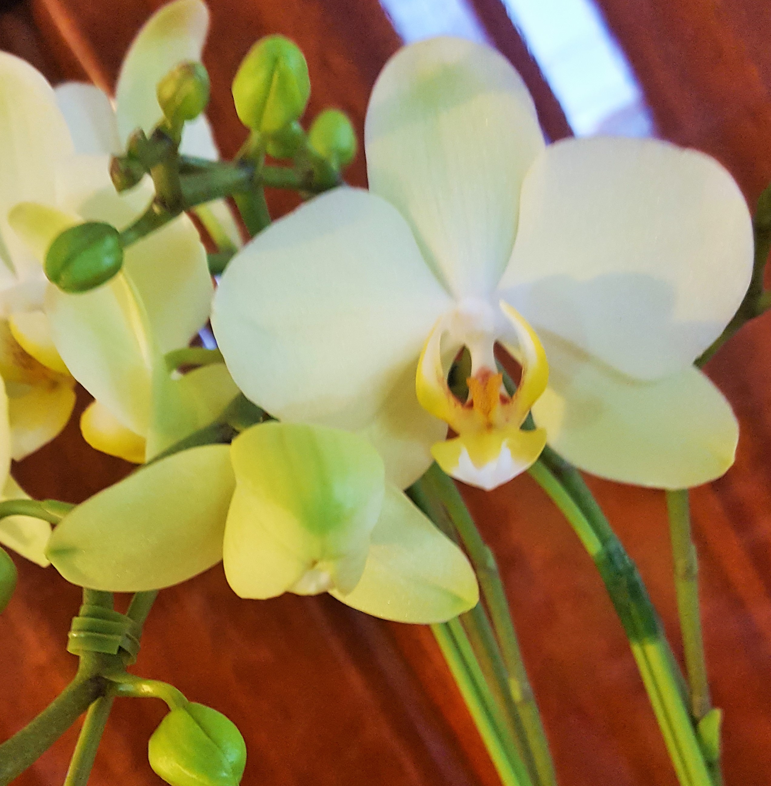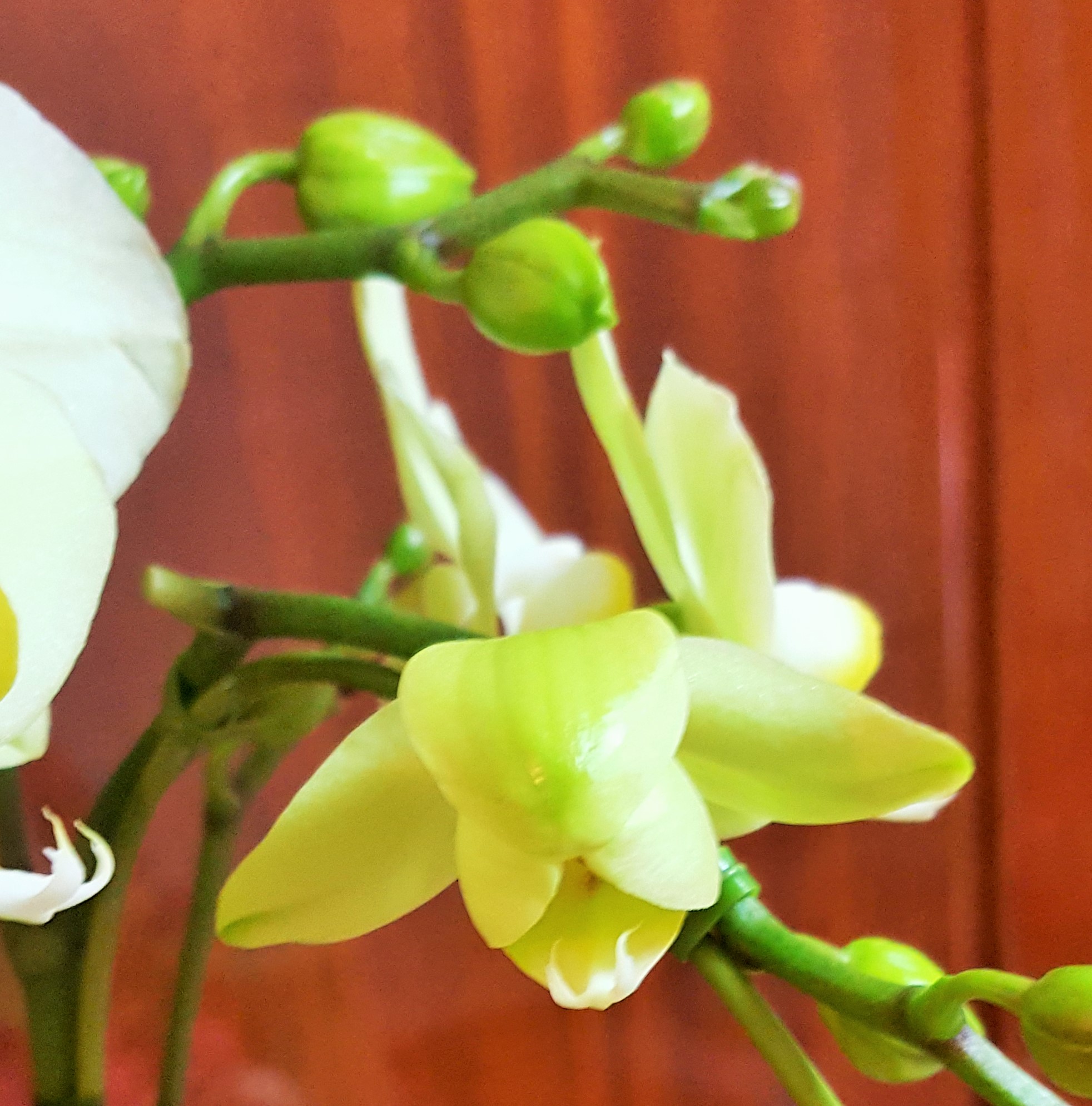 Mademoiselle Vert shows 10 flowers right now. First, a bud begins to look bigger, white and round. Secondly, one of lower petals is removed from a shape of folded ball, followed by another. Thirdly, the left ball opens a little to smile, waits for upper three petals to stand up. Mei-Shun should have watered her enough, yet oh, left her thirsty instead for as long as 2 weeks. Sooooo sorry.