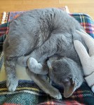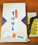 Meow, dad brought home a souvenir from Okayama Prefecture where delicious white peaces come from. Of course it is 吉備団子, rice cake ball which 桃太郎=momo-taro, a hero born from a big peach gave to a dog, a monkey and a pheasant to make them his disciples. Purr, I love your shape, friends. Did you curl yourselves like I do on mom’s legs?