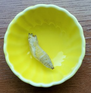 StandardMei-Shun found the pupa stayed at the porch already empty this morning. Yes, Shin told her last night that its color changed from bright green to brown at the bottom. So a beautiful swallowtail butterfly was safely born here. Which of you flying above our garden is the one? Anyway, let her pick up this shell to dry and keep as an amulet. Oh-oh, it sticks to the wall so tightly that requires scissors to remove.
