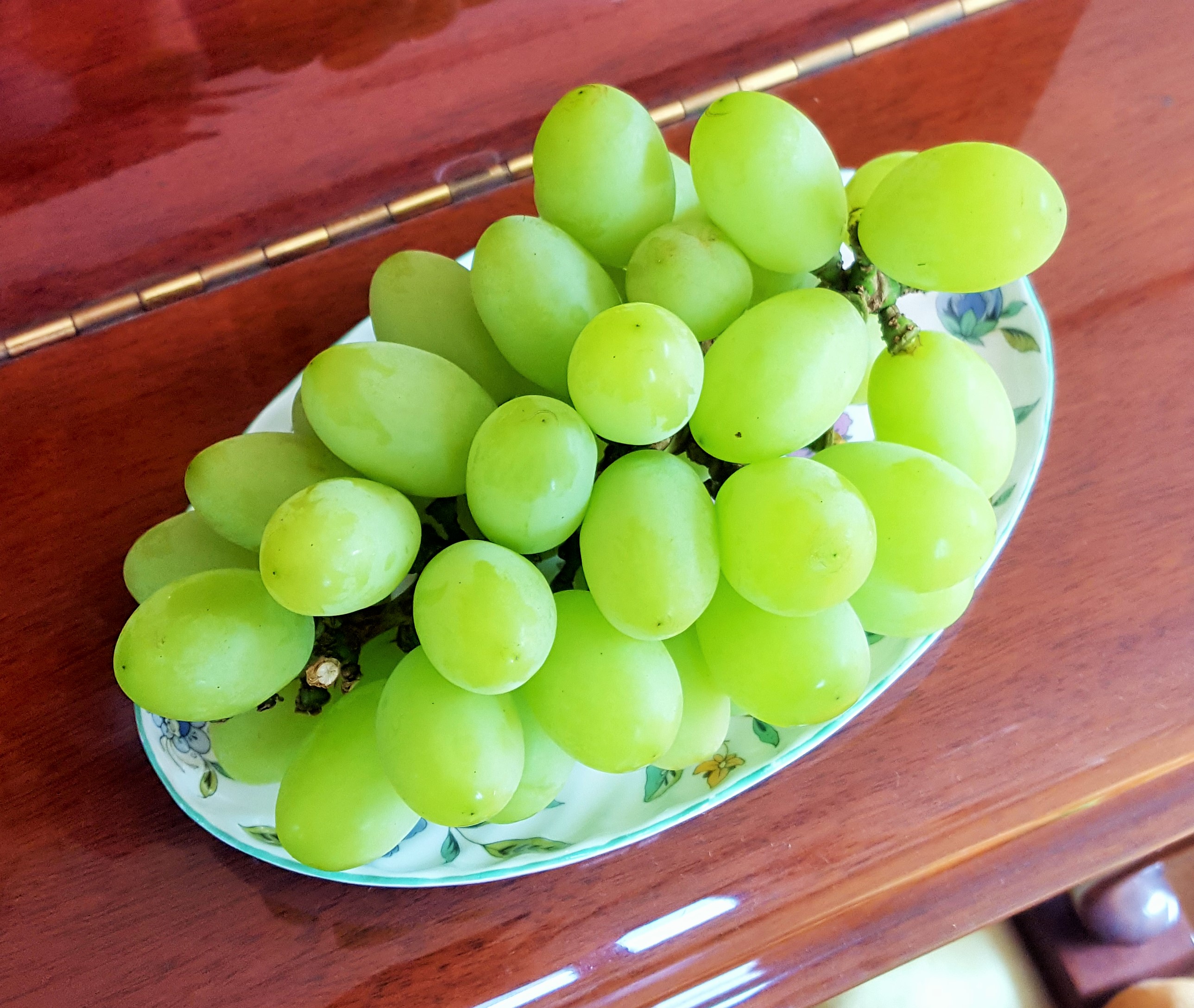 In the fruits field follows below. Her name is “Pizzuttelo Bianco”, from “pizzuto” in Italian meaning “pointed”. That really makes sense: she is also called “Lady’s Finger”. For Mei-Shun, it tastes lighter than “Shining Muscat”, made a debut a few years before to become quite popular these days. Both of them were included in big 4 boxes of gifts for Shin.
