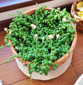 Necklace finally bloomed. Mei-Shun was very happy when saw one flower in a pot, happier as others follow in a few days. Since several buds were grown outdoors, she let them join indoor friends. On the other hand, 豆苗 or pea seedlings came to her kitchen for the first time. According to an explanation, second harvest would be available in a few weeks. How do you feel in this package of Cobb salad?