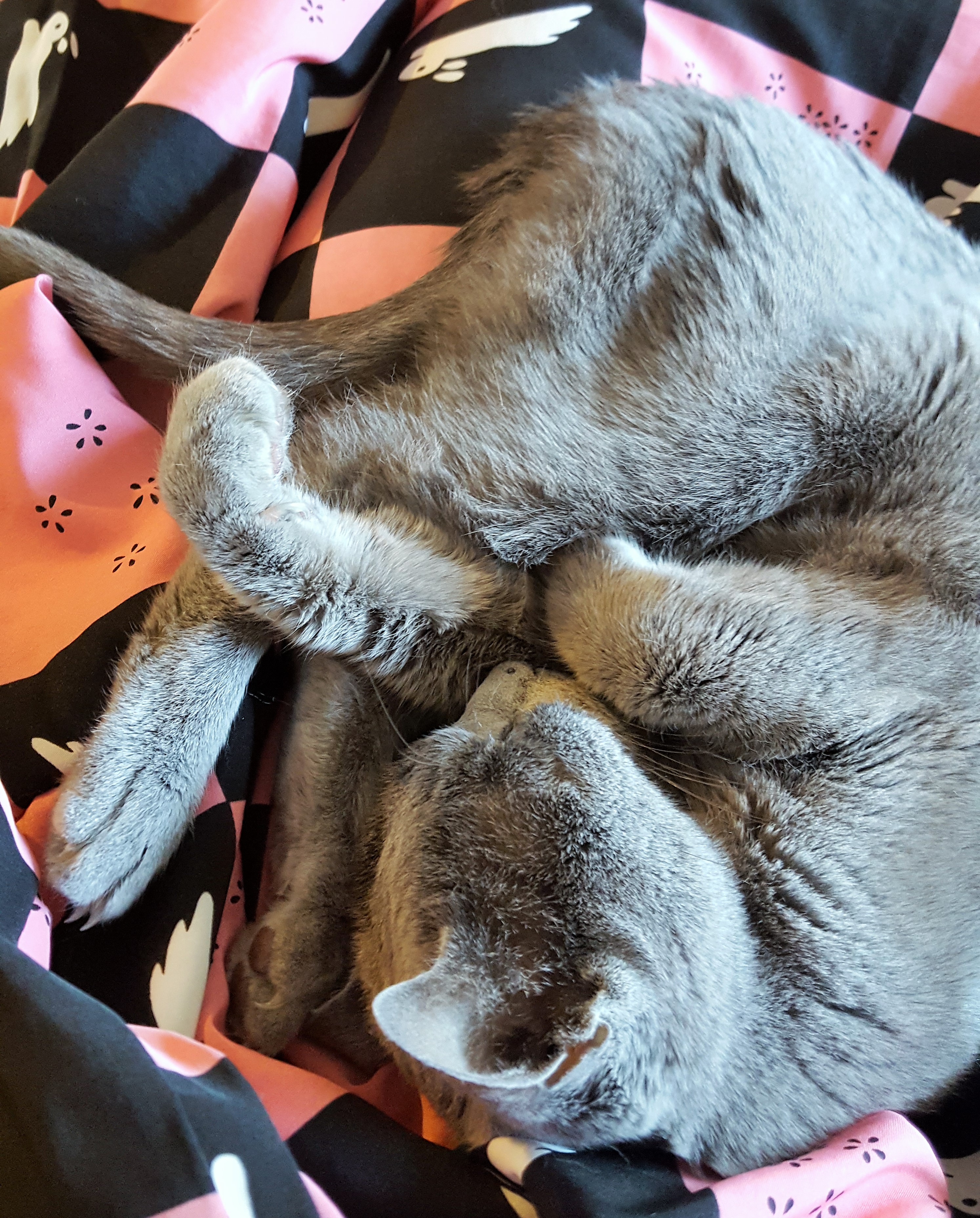 StandardMeow, mom lets me stay free from the cage at night these days. It is very comfortable to relax on the sofa covered by clean blankets, with warm wind coming down from an air conditioner. Two restrooms became available; one I’ve used from my kittenhood, another bigger set beside a refrigerator. Thanks mom, I feel much better. You are always welcome to get up before dawn. Hold me for a while, purr. Purrr …