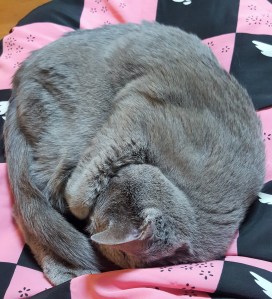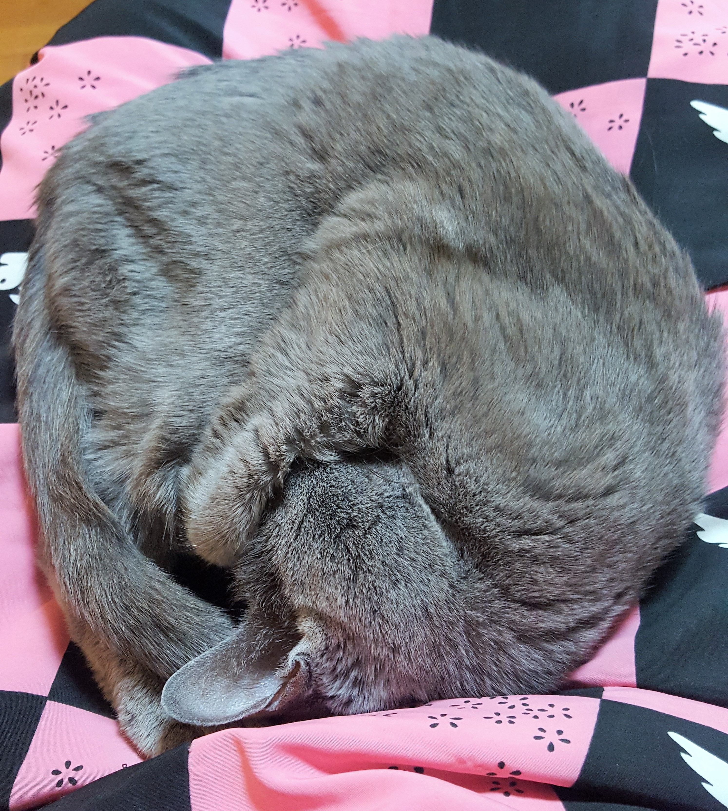 StandardPurr, it does not only express me on mom’s legs but rice cakes she is into these days. Dad bought them in Kyoto last year-end, too much to consume within new-year holidays. She wraps up frozen one by two pieces of fried tofu, ready to make お稲荷さん=o-inari-san or a rice ball in a tofu bag, before steaming it. Be careful not to make the same shape on your belly.