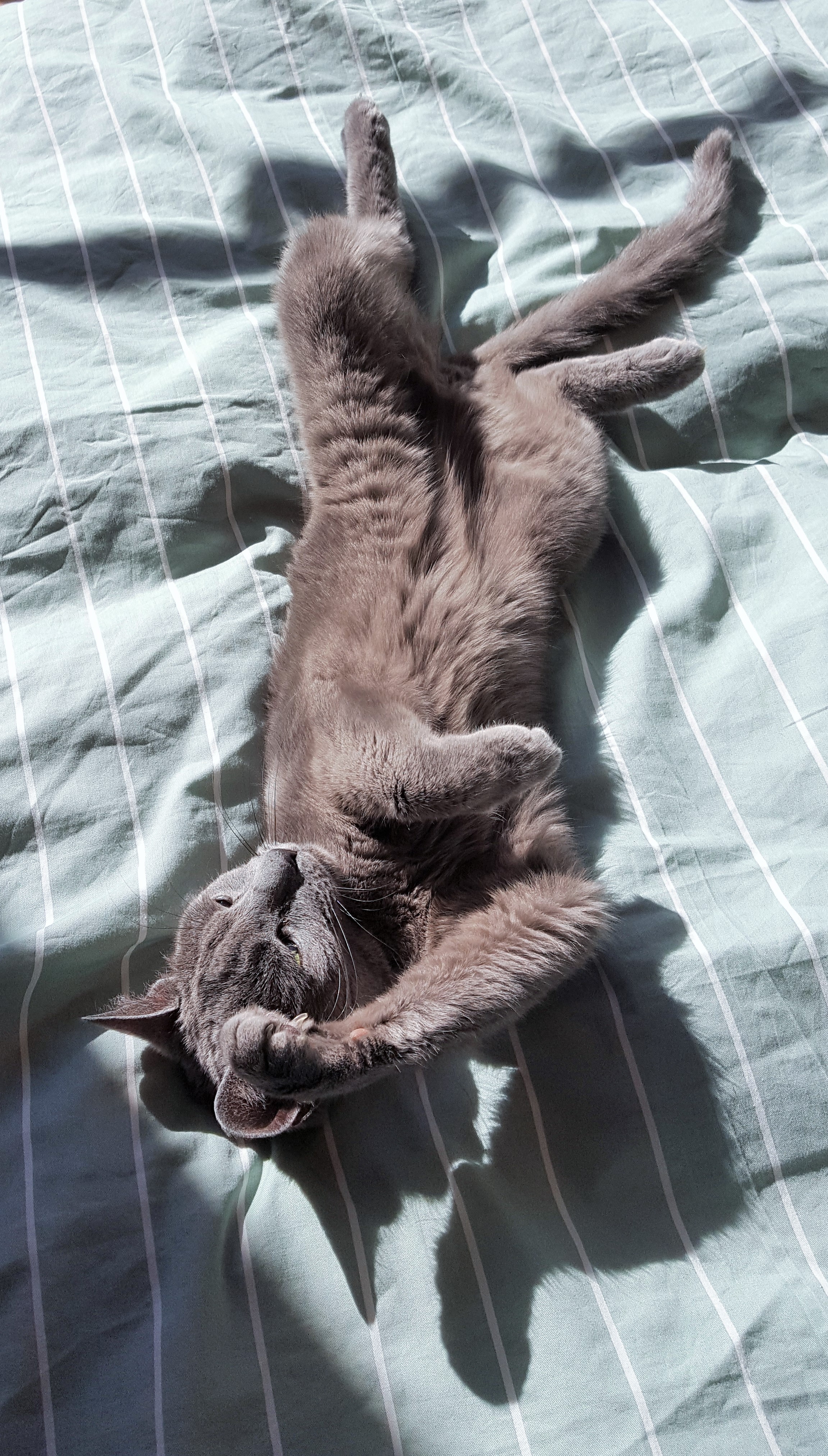Meow, it is a bit cloudy from early in the morning. Mom bought a new futon with lovely coverings, among which she chose this one full of green dinosaurs for the first night. And it is my privilege of course to relax on it in gentle sunlight, purr. After taking a slight nap with me, she left at noon to dance with horseies. All right, I’ll keep a good girl until you come back.