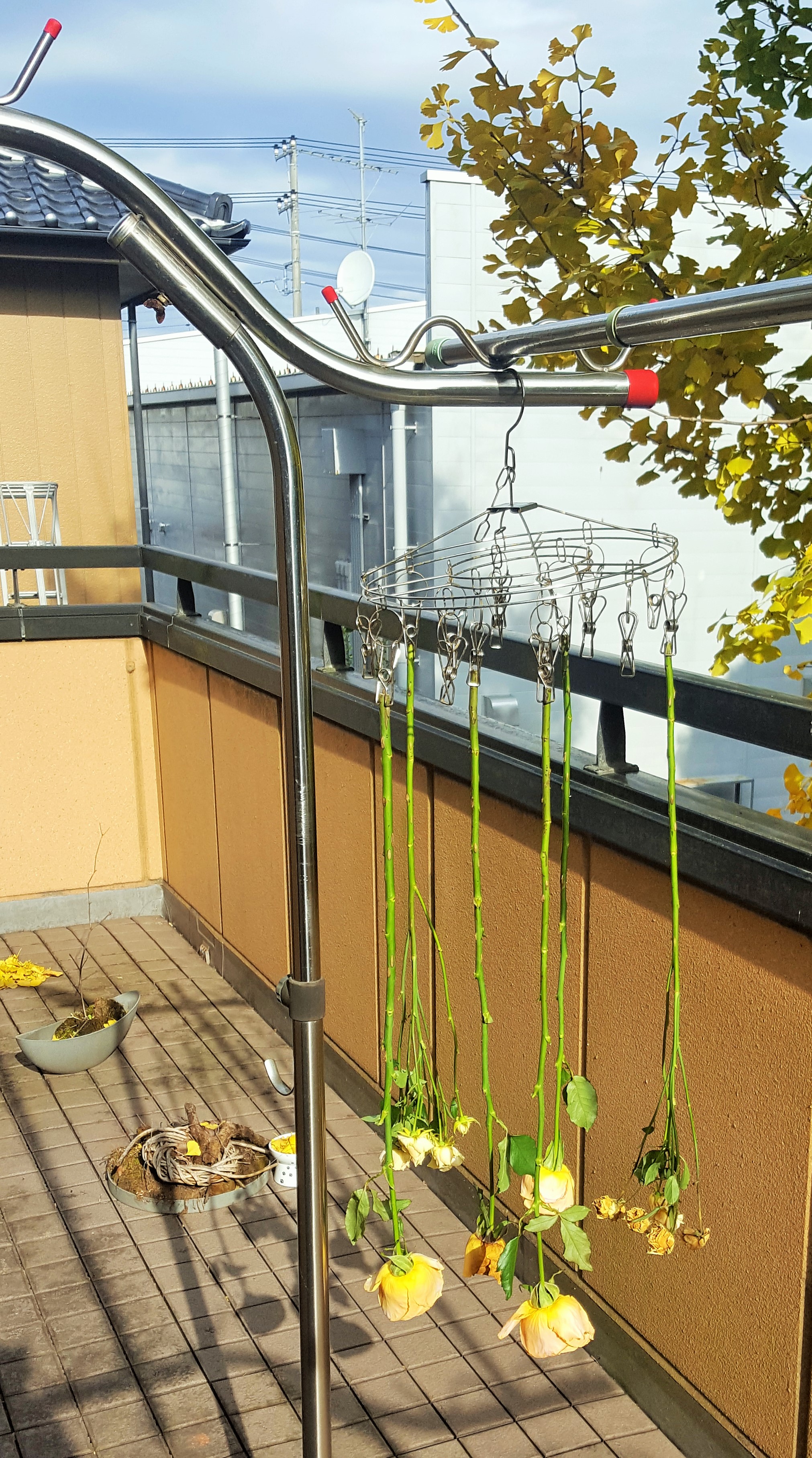 Two weeks have already passed since Mei-Shun received a gorgeous bouquet from Shin on the stage. She learned how to enjoy it for longer: draw roses from a vase before they get too tired. Hangers are ready to dry them outdoors, while fragrant and snow-white lilies stay indoors with fresh water. They gently have made bedroom of above couple full of sweet aroma.