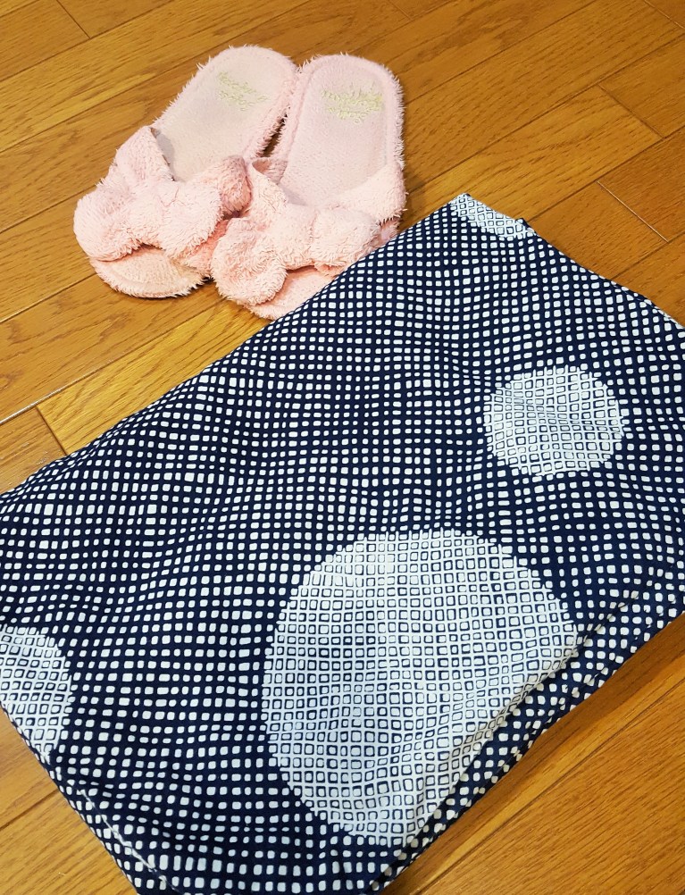 This yukata or summer kimono is from mom-in-law. Since a bit small in size, Mei-Shun used it as an underwear for longer one to practice 恋の手習い. Washed over and over, it has become soft enough to change into a bathrobe. It often reminds her of Master Mei-Shu who also gave her last 名取 many including one the latter praised when the former lady put it on.