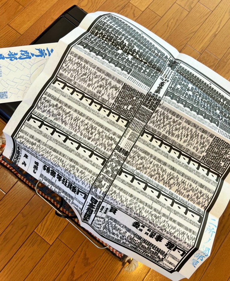 Mei-Shun received 番付表 of sumo wrestling held in Osaka from 12th via Shin the other day. He is not so much a fan of this sport, yet kindly joined a group to support nearby 二所ノ関 stable for his wife. Oh, one of them re-entered 十両 rank where her favorite 力士 belongs at the top. By the way, her tall friends living also in stables gave a bit dance today.