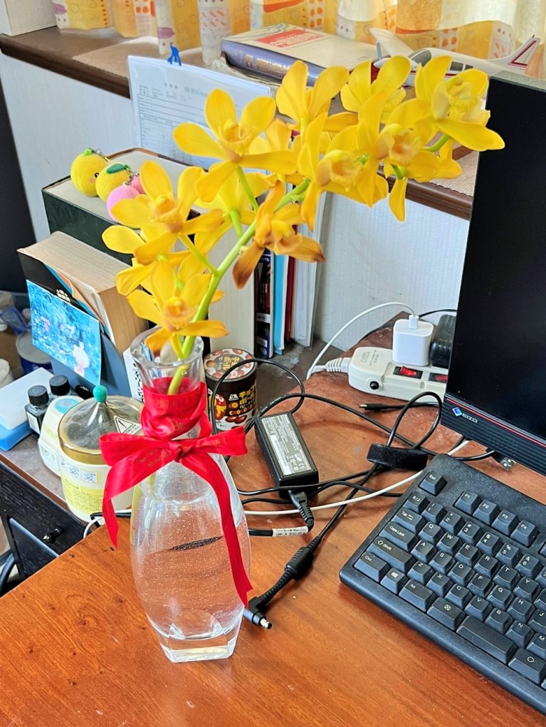 StandardElder sister of Princess Cymby seems a bit tired these days. Since she first bloomed on Mei-Shun’s birthday, as long as 80 days have passed. An instruction book says if flowers get browner, they are no longer worth appreciating. Such a comment sounds cruel, while bulbs must be kept healthy. She therefore cut Her Highness from the bottom, served a wine bottle as the 2nd throne.