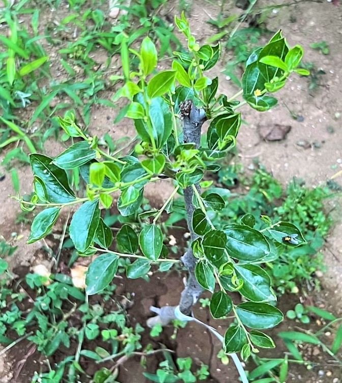 Mei-Shun found above 棗=jujube blooming. Tiny flowers in light green are difficult to see from a distance, yet she noticed them thanks to rice — water used to wash it is kept in an old kettle shaped like an orange (or helpful Mikan-chan). Then it works as a nutritive fertilizer, spread onto plants in our garden. Not only feeding many of us, this great staple food also grows tasty fruits.