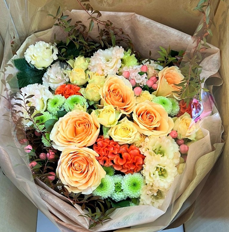 … mean that couple gave birth to Mikan-chan 20 years before. Shin and Mei-Shun, human pair who adopted her, are happy to reach 30th among their anniversaries today. Above bouquet seemed the same as last year, yet the wife recognized something different. When she compared it with photos, it became clear: percentage of green and white in tiny chrysanthemums.