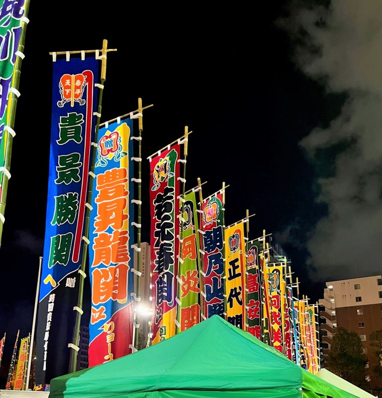 The only sad matter for Mei-Shun regarding current 九州場所 was absence of her favorite rikishi. They say he was injured in a leg during 巡業 tour held in October. So hard a job it is, building strong muscle and mind simply coated by their own fat. She therefore cheered all wrestlers, putting on a 羽織 jacket. Now it is over, let’s go to a restaurant serving longtooth grouper loved by above guys.