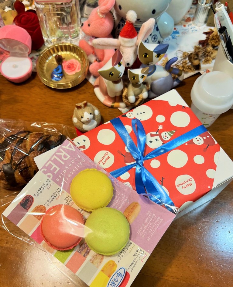 This is the last day in 2023 for me and mom to visit “Arles”, purr. A bit rainy under sky full of clouds, we got on Ms. Scarlet. 95% trees lining main streets in Tsukuba already took off colorful coats: only 5% keep still beautiful bright-to-dark red. I prefer such weather which make us sleepy, to freezing one eyes wide open. Here are delicacies we won including a macaron of my flavor or 福来みかん.