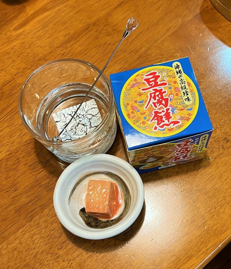 … it is today, our fiscal 2024 starts from Monday. Dad brought home above on weekend, let mom feel happy to see it after decades perhaps: they visited Okinawa for the first time together just after marriage. She loves 泡盛 distilled sake there, while took this tofu product as a bit weird. Now grown up enough, it is taken great accompanied by 鵜戸詣 from 宮崎 via kind Professor M.