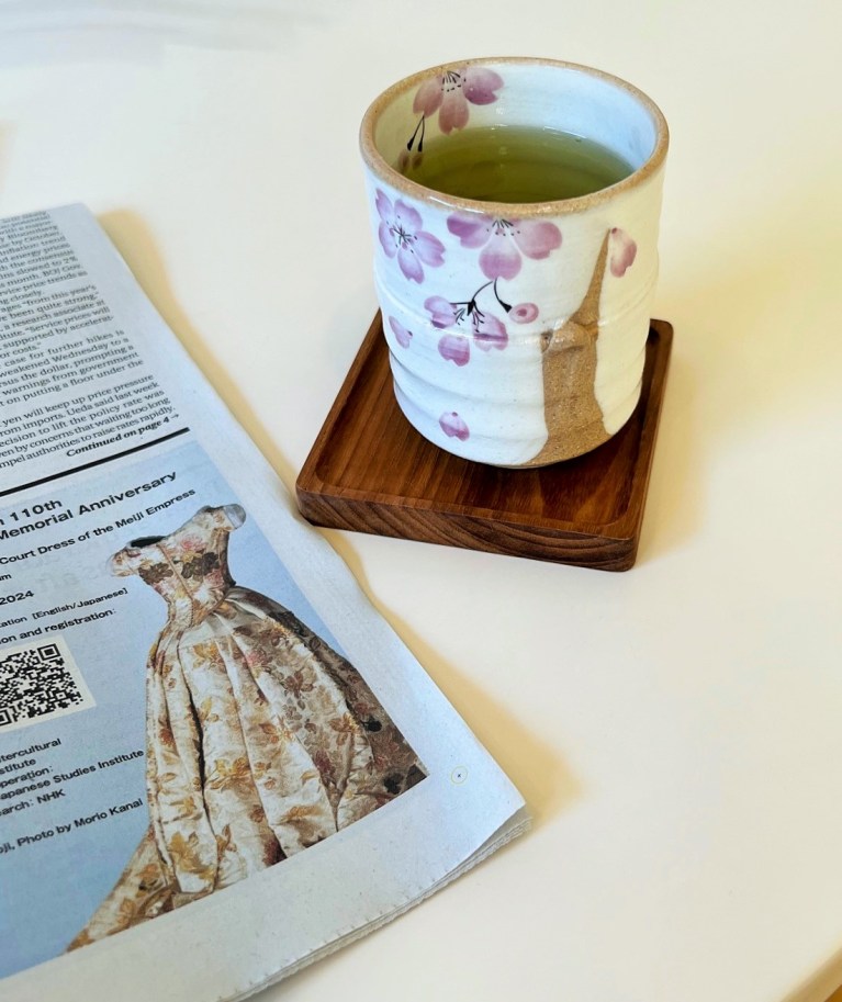 Mei-Shun walked to a hair salon the other day, in high-heeled pumps as usual. She enjoyed reading news paper on green tea until dyeing medicine calmed down. Oh, an exhibition featuring an empress of our Meiji period is advertised. The potter made above cute cup might be inspired by this dress. By the way, why does her right ear get so black even after bath?