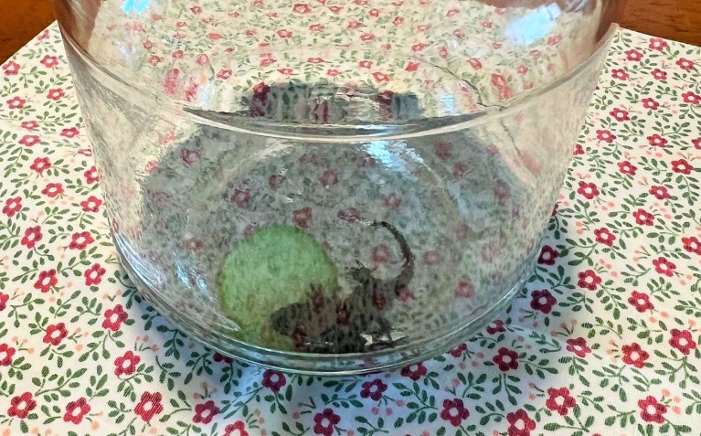 Hi, little friend. Mei-Shun met this house guardian downstairs, precisely behind bathtub lids. She asked mom-in-law to take him/her as a guest after showering for a few days last week. When she stepped down early yesterday morning, an empty bottle of coffee was found holding something within. Well, it might be suitable to accommodate him/her here, while cucumber not on their food list.