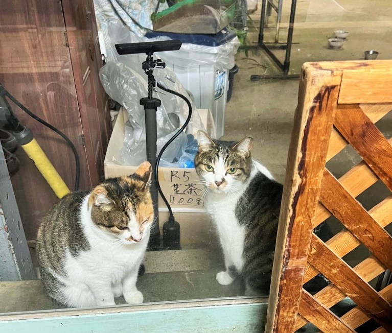 Mom met them at a tea shop she recently visited for the first time, purr. Since her favorite one was closed months before, she decided to try another nearby when purchased bags of green tea were all consumed. Hi friends, would you like to enter? They never do, even if she opened this slide door. “Oh, please don’t”, the owner lady asked mom who rang a door bell on a desk to call the former.