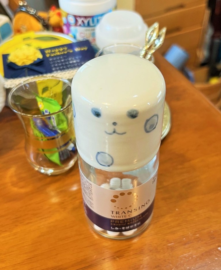 Mei-Shun’s irritation mark on right arm has almost disappeared, thanks to excellent medication. She is usually cared by pills to alleviate melasma, who requires 2-month taking before respite for the same period. Since above trouble occurred during the latter, she adopted similar one whose ingredients work to lessen pigmentation. A paperweight from 砥部 fits its bottle cap.