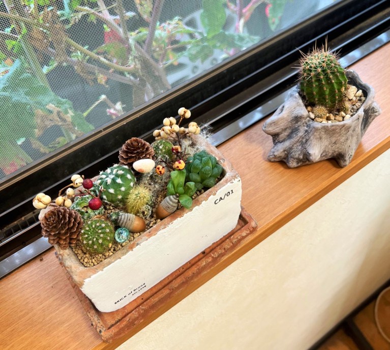 StandardThey live at a hair salon Mei-Shun always walked to in high heels. Her beautician said that one in a cuboid pot stayed in a “hospital” for a while: a couple whose wife is a client here dealt with it. Our population includes some succulent plant lovers, while this lady might prefer container gardening or bonsai. The other looks like growing on a tiny stump, giving a unique atmosphere.