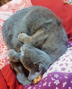 Now, it is your turn. Rouge-pink roses in that pretty Christmas bouquet from Shin are ready to go outdoors. Madame Biscuit, Mei-Shun’s first kimono with her family crest 浮線蝶 looks also happy to go out of a drawer. Her sleeves are much shorter than 振袖=furi-sode, many women who reached 20 years old put on today to participate in municipal coming-of-age ceremonies.