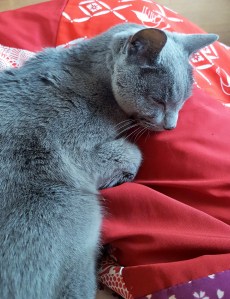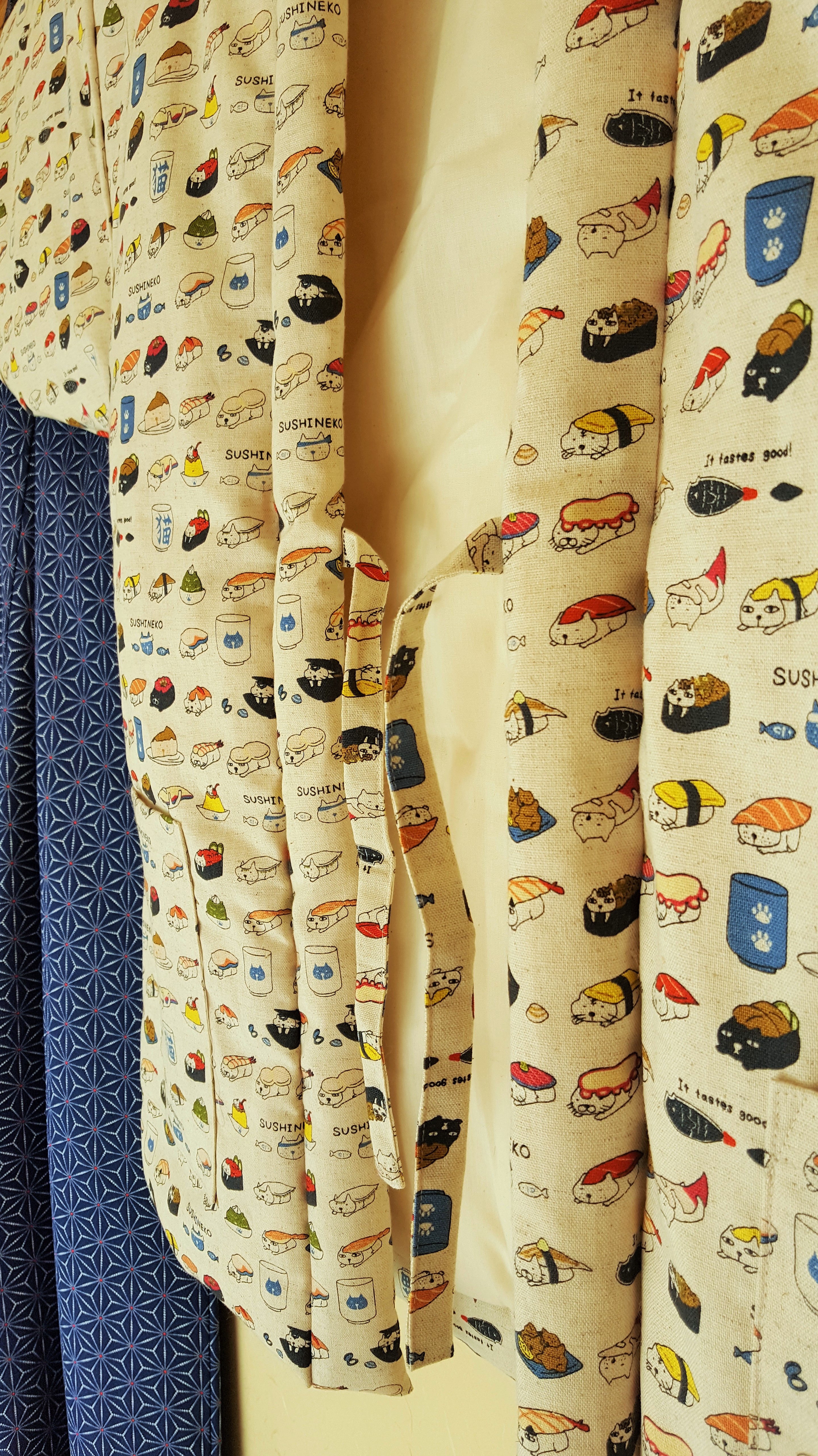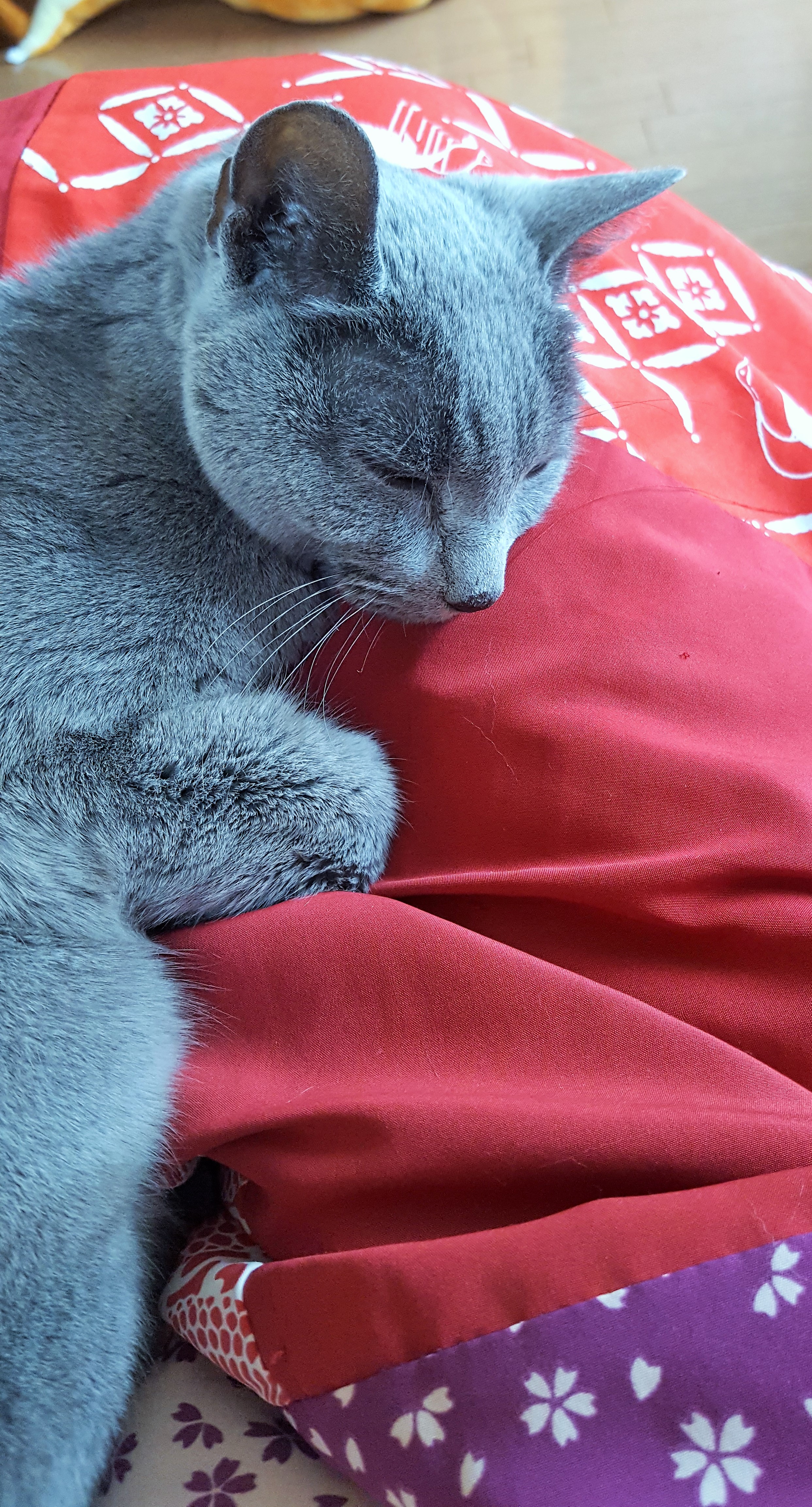 StandardMeow, it is my special day comes only once a year. Mom purchased a 半纏 kimono coat, full of my friends and sushi to give me her older one. She would not put it on when practices or takes lessons of kabuki dance like today, just to relax at home. And it is my job as well, taking a nap with soft-touch colleagues on the sofa … hi, welcome back, smooth me who kept a good girl while you were out. Purr … purrr …