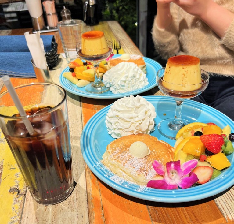 StandardMei-Shun and M-chan dined at a Hawaiian restaurant, ordered fried chicken plates first. They call it mochiko or rice-cake powder coated; crispy surface, juicy meat. Fairly delicious, yet 4 pieces might be a bit too much. Now dessert has been served, the same choice. The former had just one pancake, the latter young woman 2. You have white and silky hands, honey, like these mountains of whipped cream.