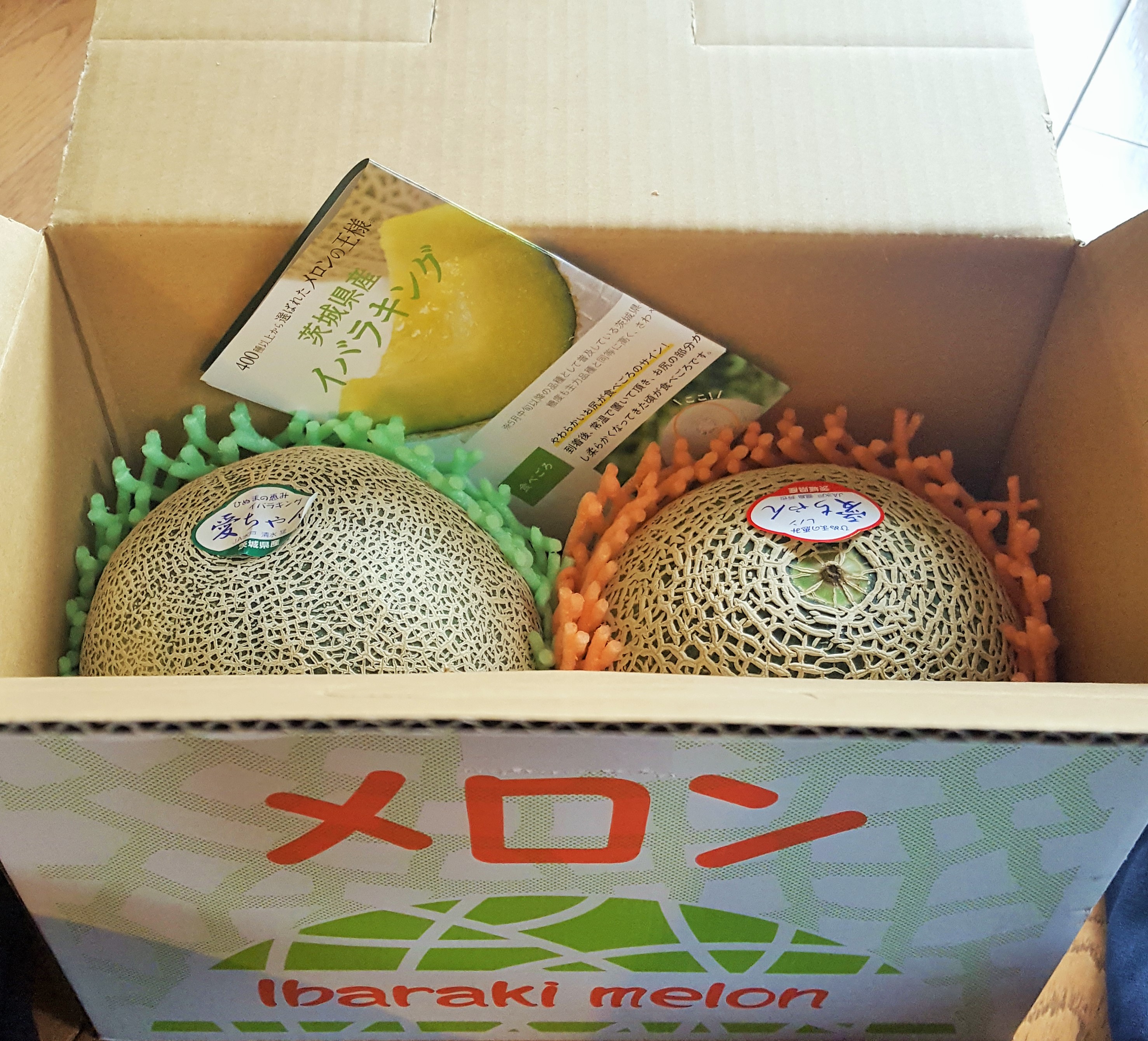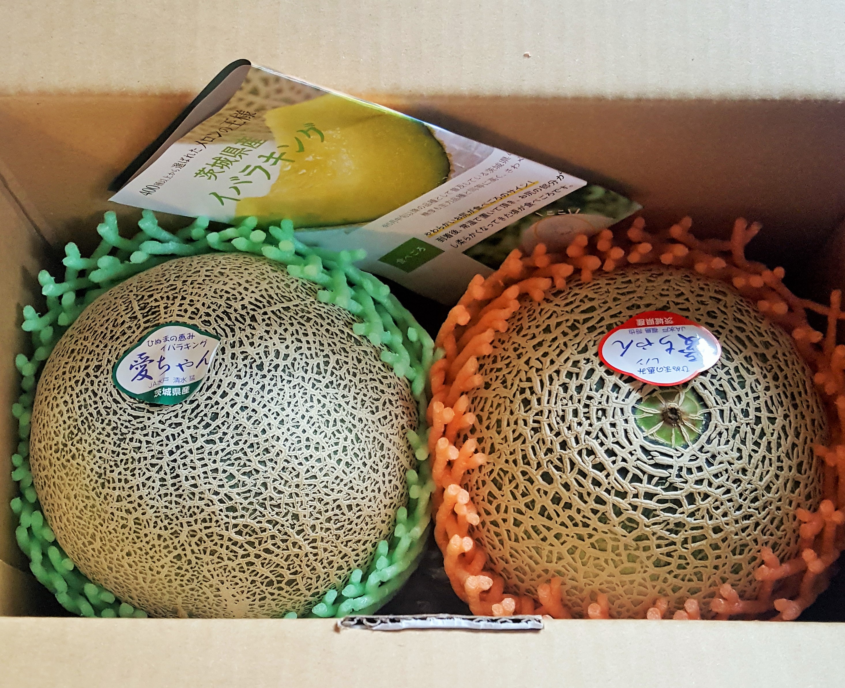 StandardYes, one in green flesh while the other orange. Shin, a generous orderer and Mei-Shun enjoyed the former this morning. Cut into quarters, one piece was delivered to mom-in-law of course. Oh, how sweet and juicy it is! According to attached instruction, their best time would be shown at the bottom: when we touch softer there with sugary scent, let them stored in a refrigerator.