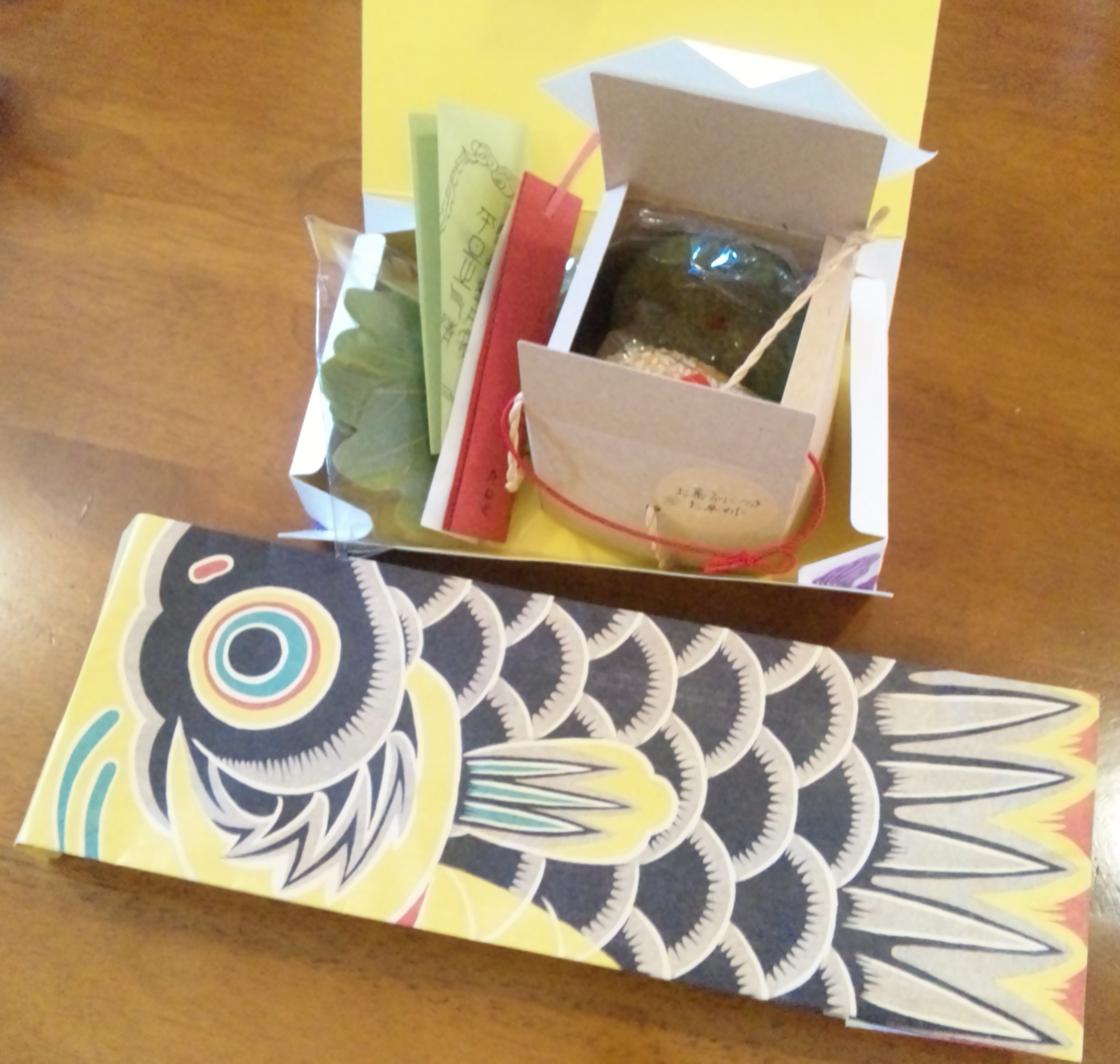 StandardThese are Japanese sweets to celebrate Children’s Day, sent from Tane-ya, including chimaki (=sweetened rice cake wrapped in a piece of bamboo grass) and kashiwa-mochi (=rice cake filled with bean jam). The former was found in a paper bag on which a carp streamer is printed.